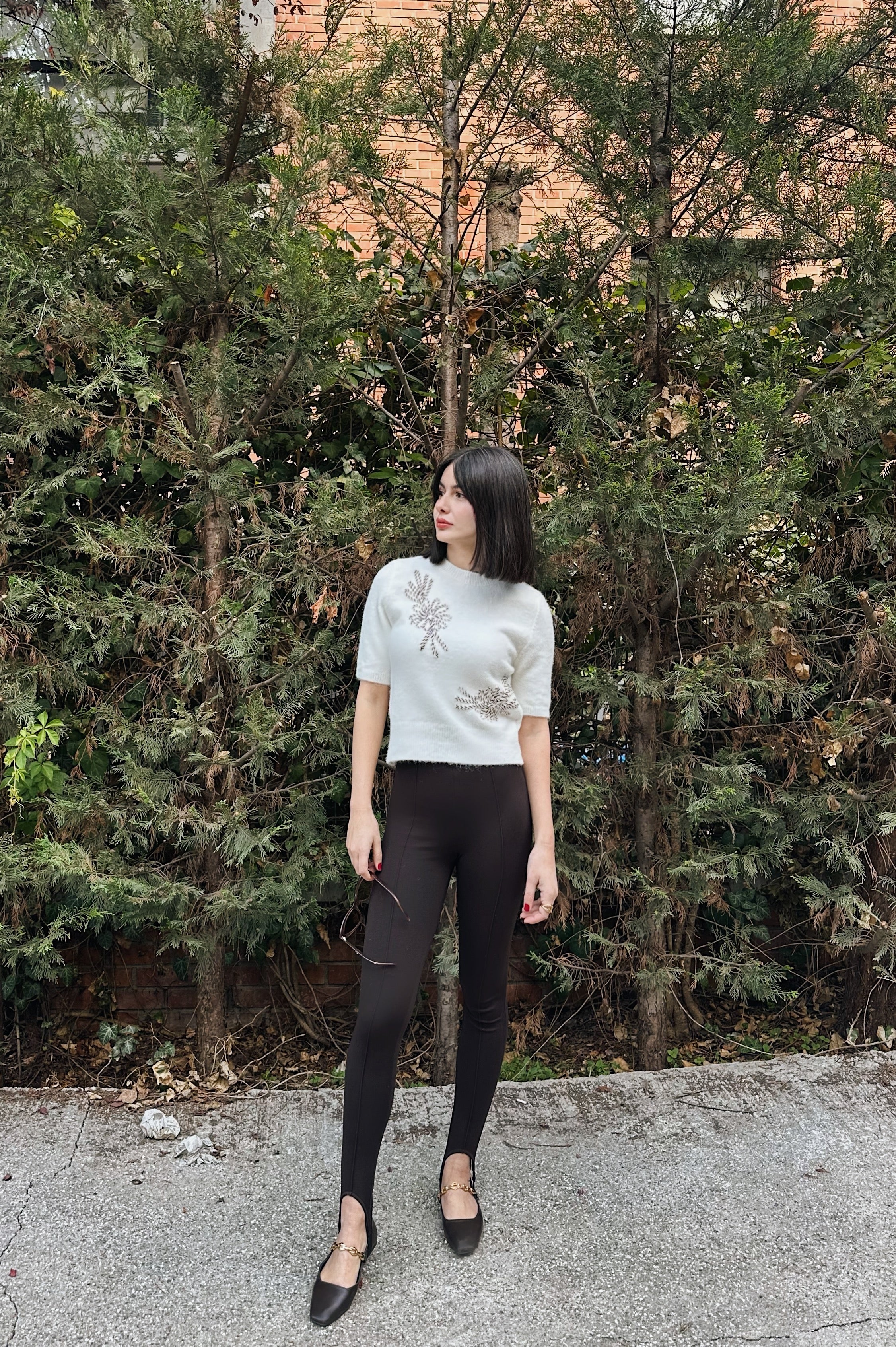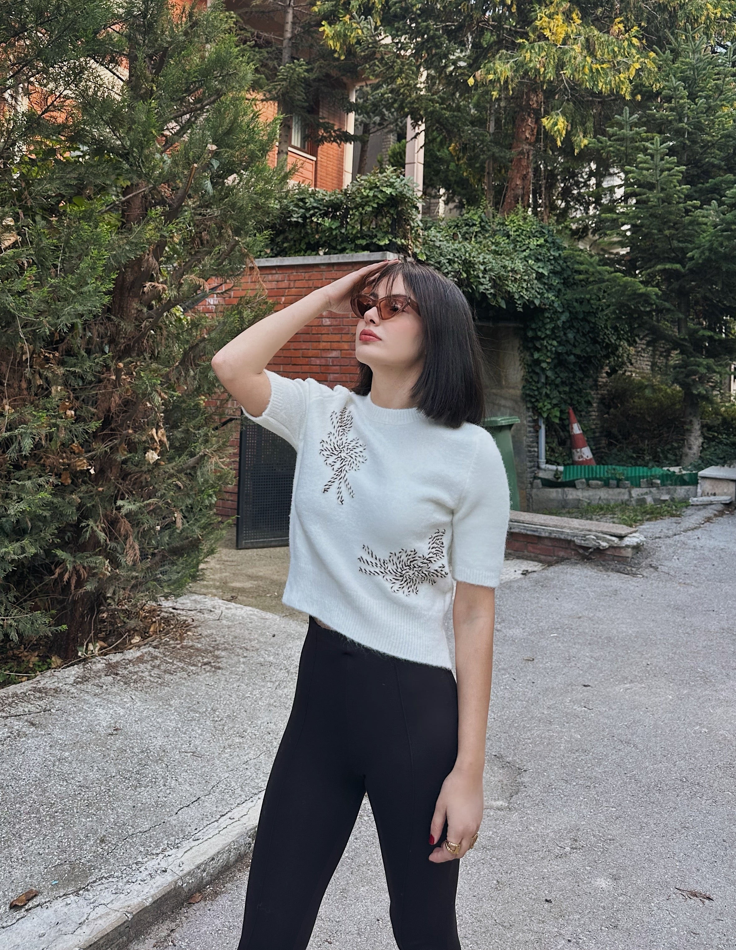 Ürün özellikleri: Yarım kollu ,nakış detaylı yün kazak.