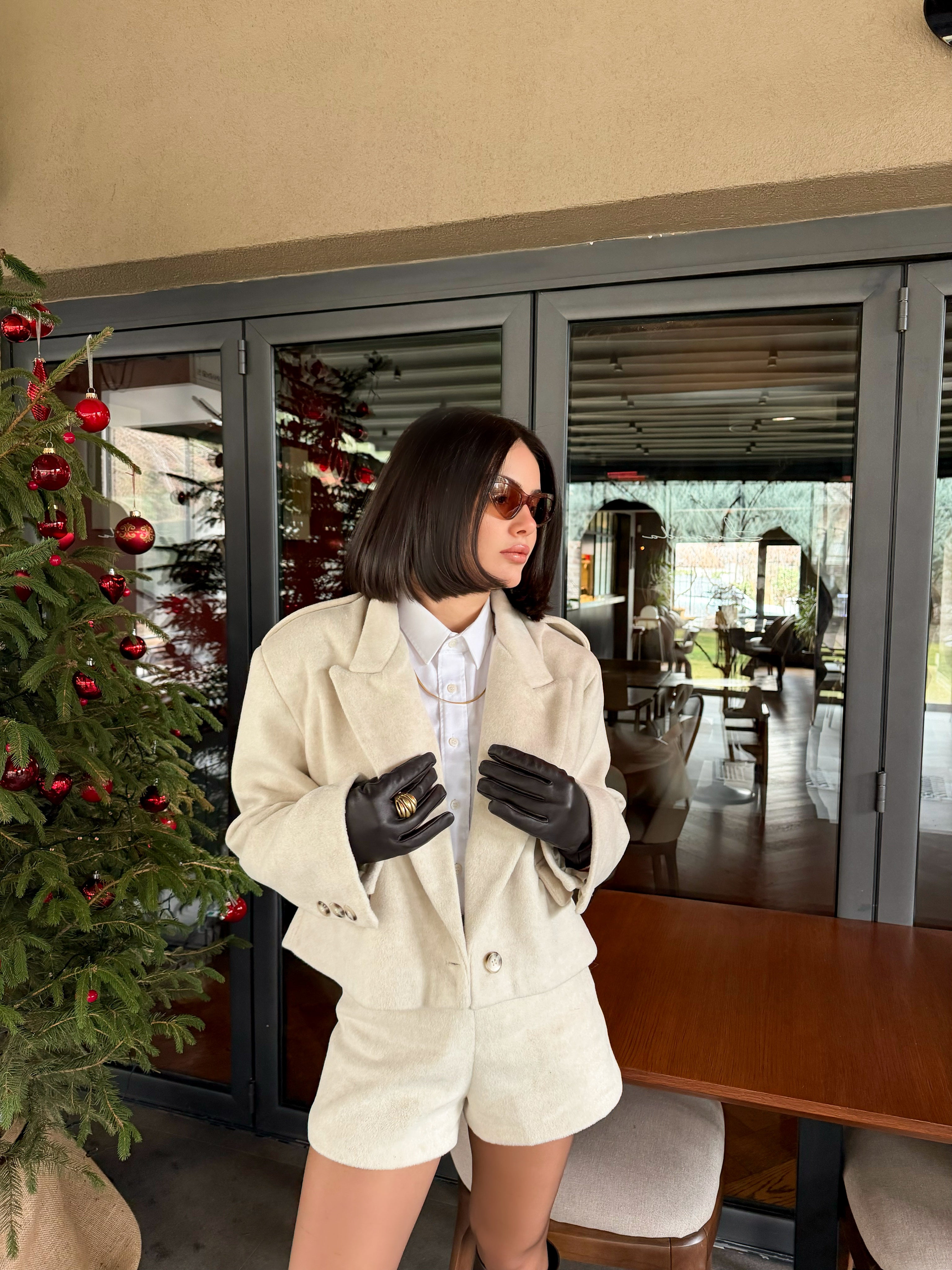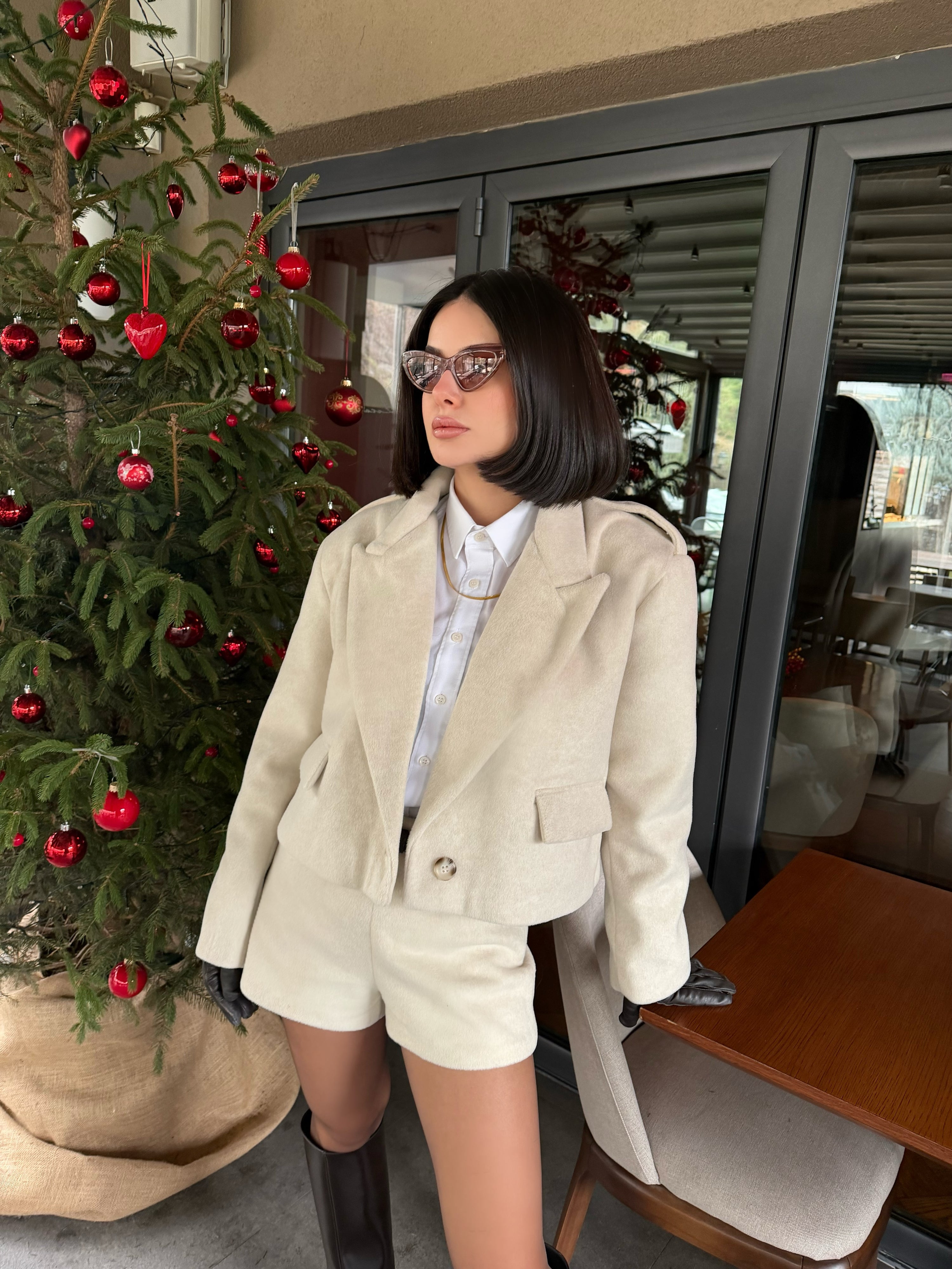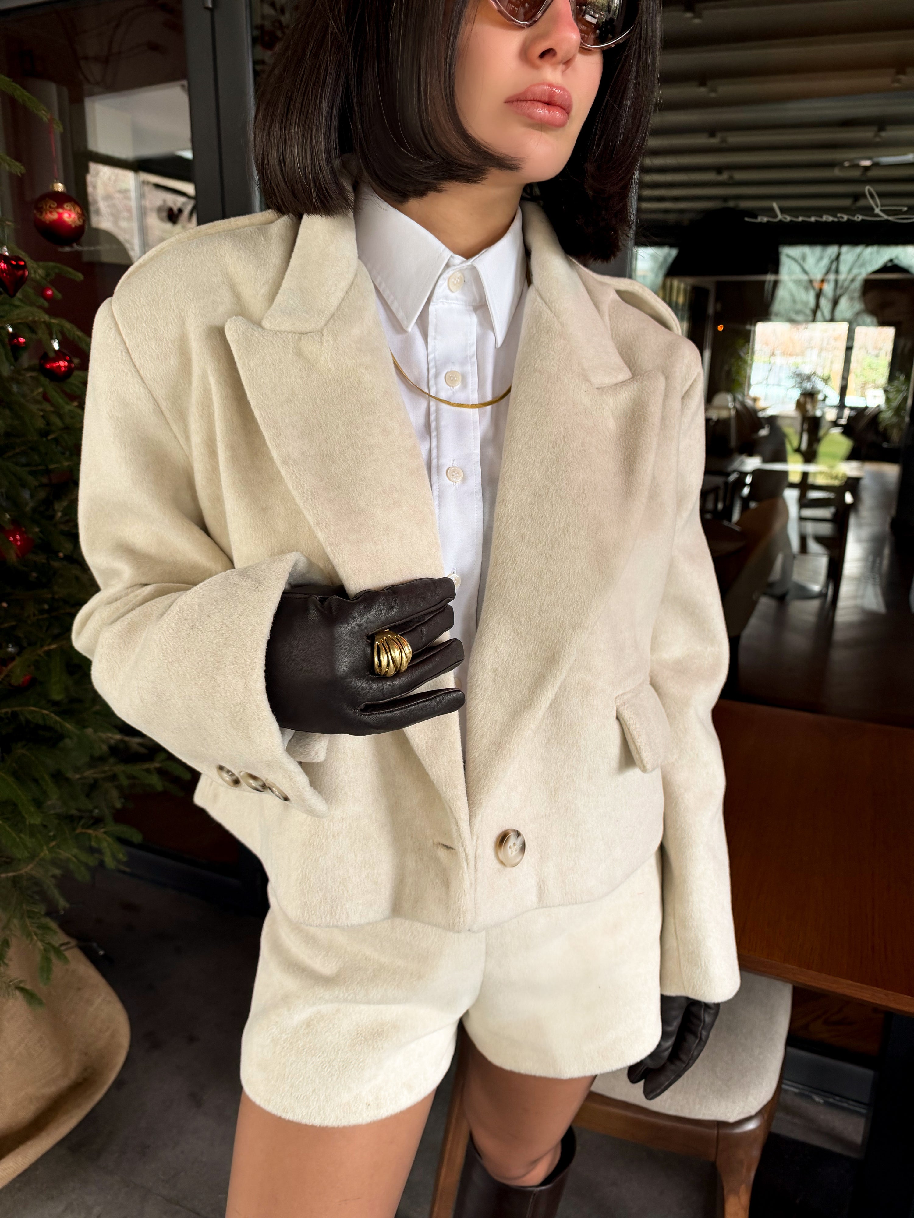 Ürün özellikleri: Yün dokulu, vatkalı,düğmeli,oversize ceket ve yüksek bel şorttan oluşan iki parçalı takım.