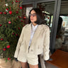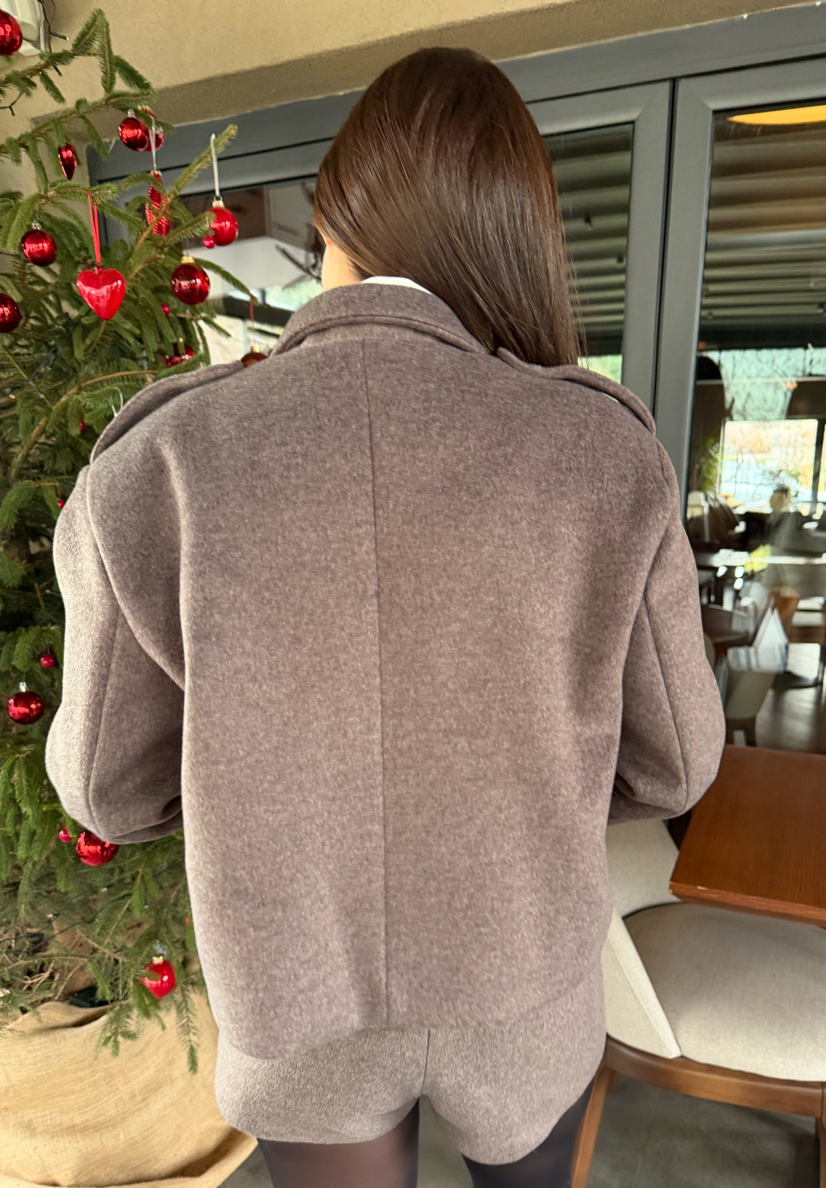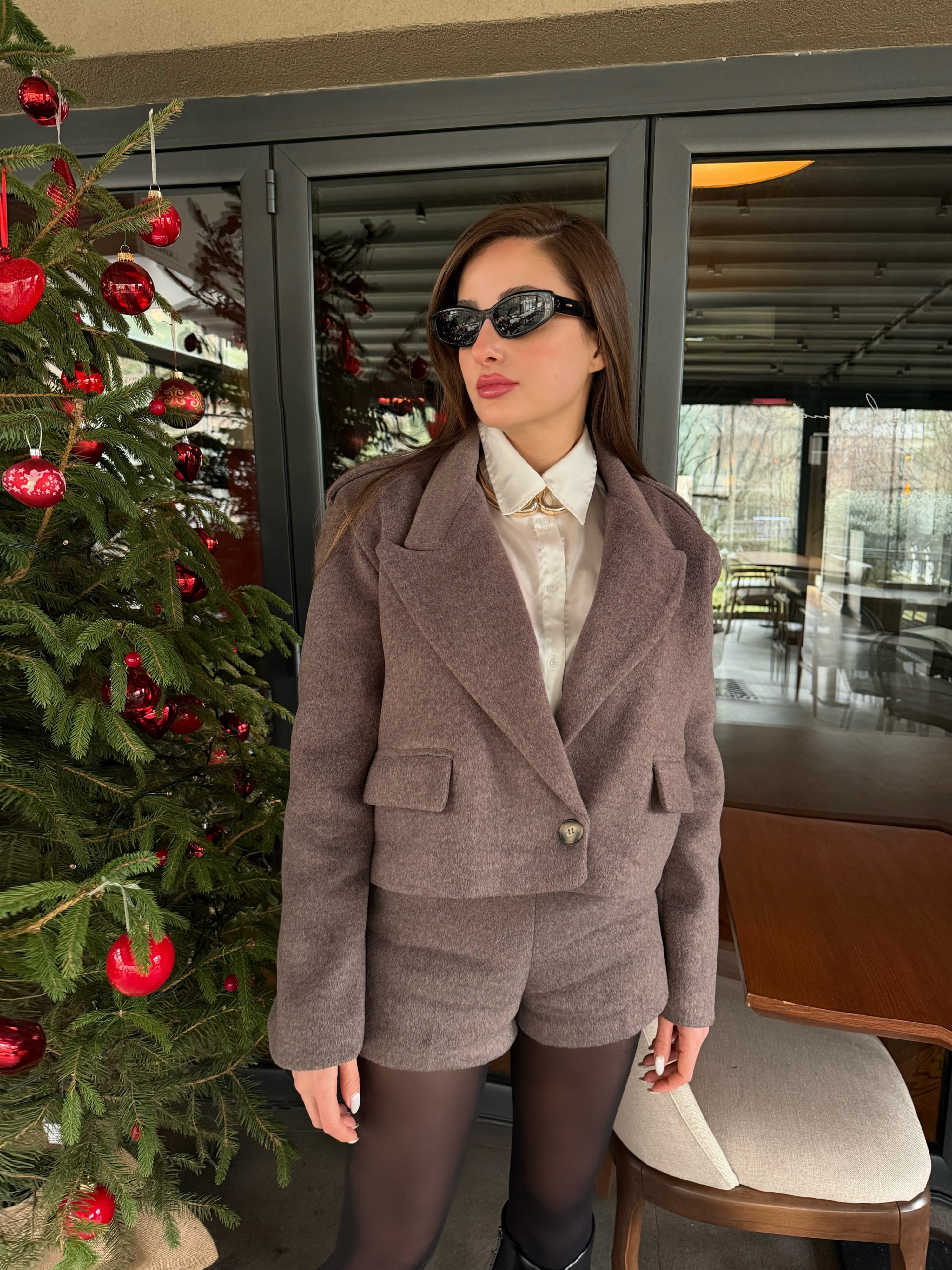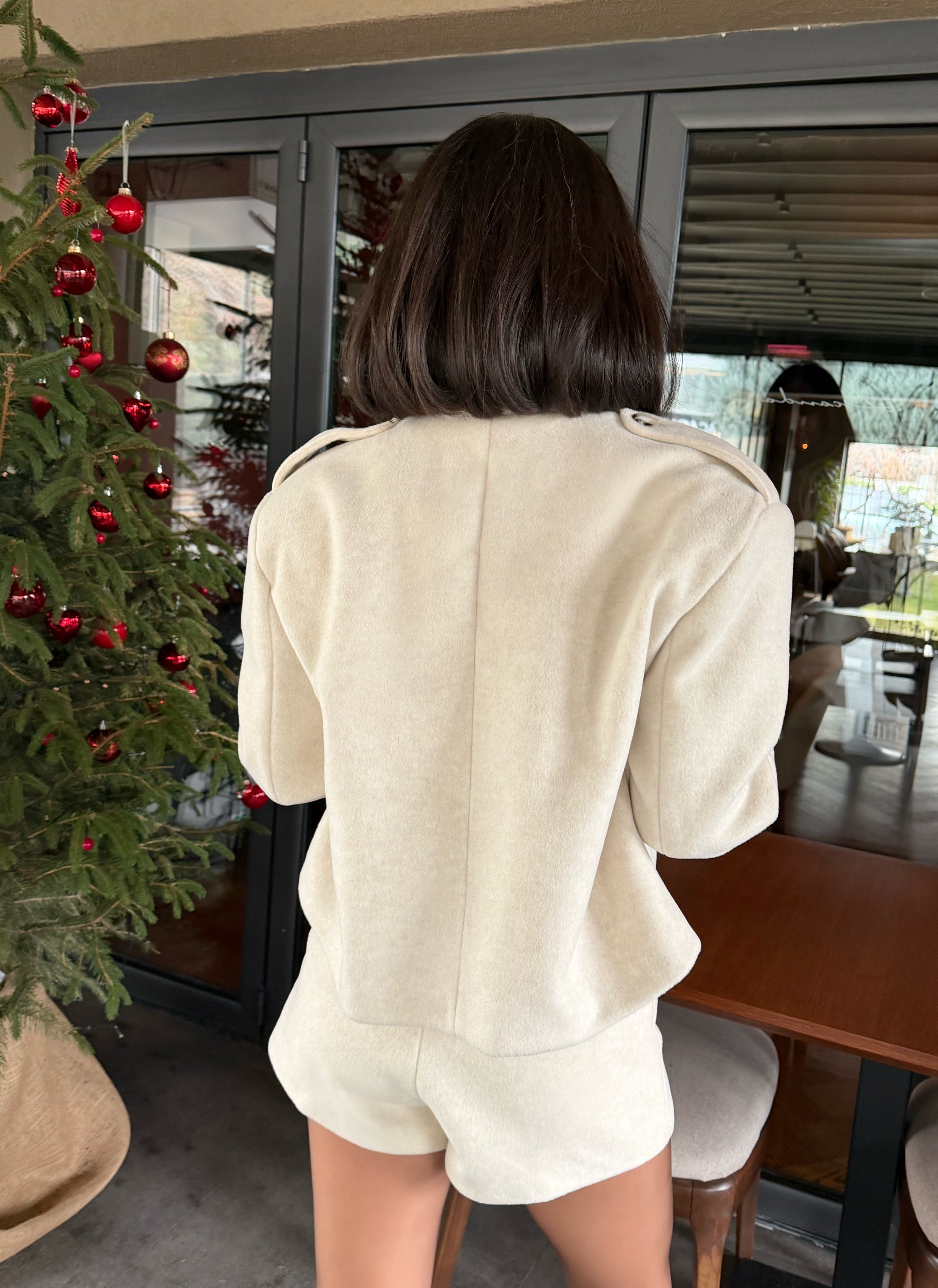 Ürün özellikleri: Yün dokulu, vatkalı,düğmeli,oversize ceket ve yüksek bel şorttan oluşan iki parçalı takım.