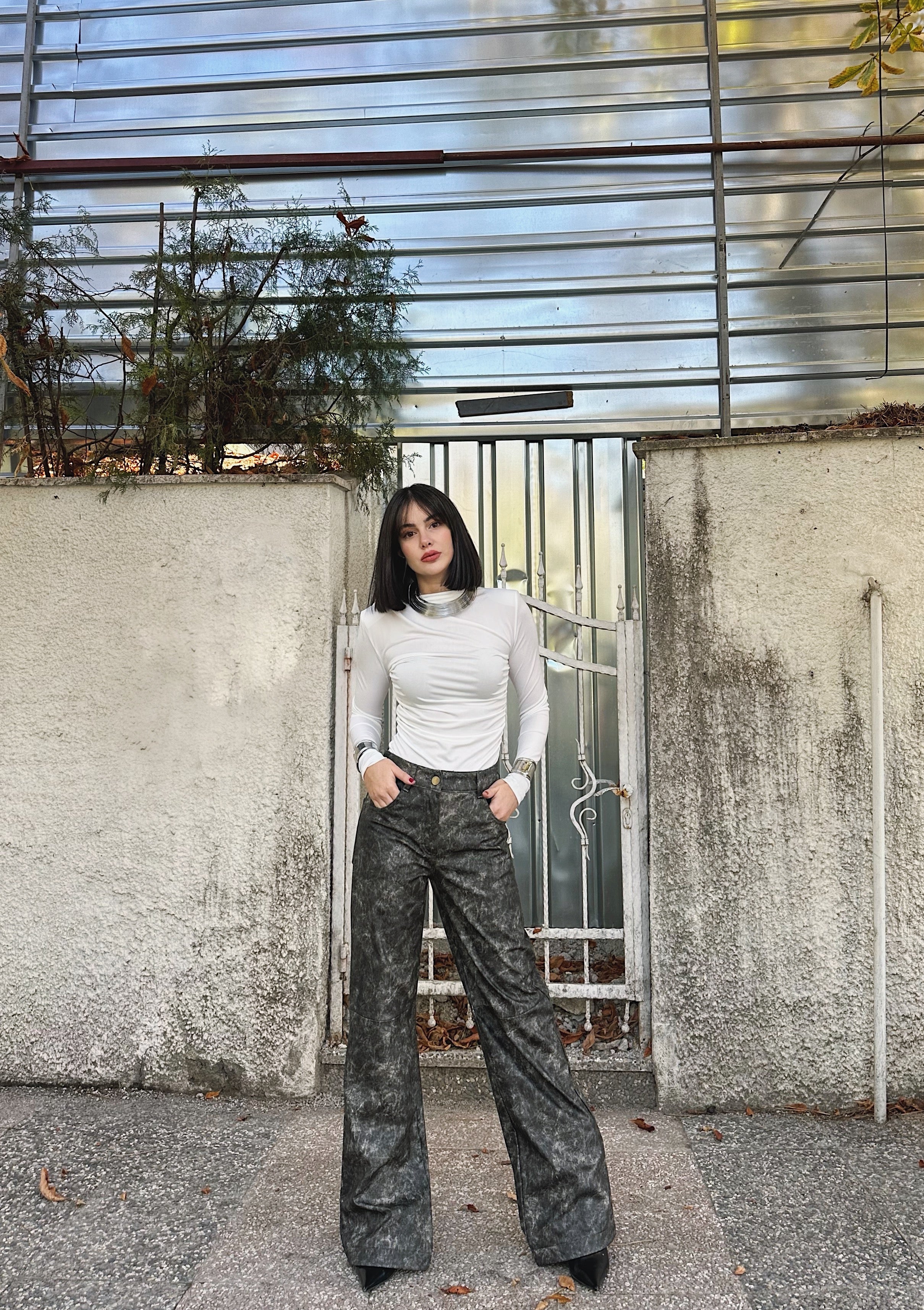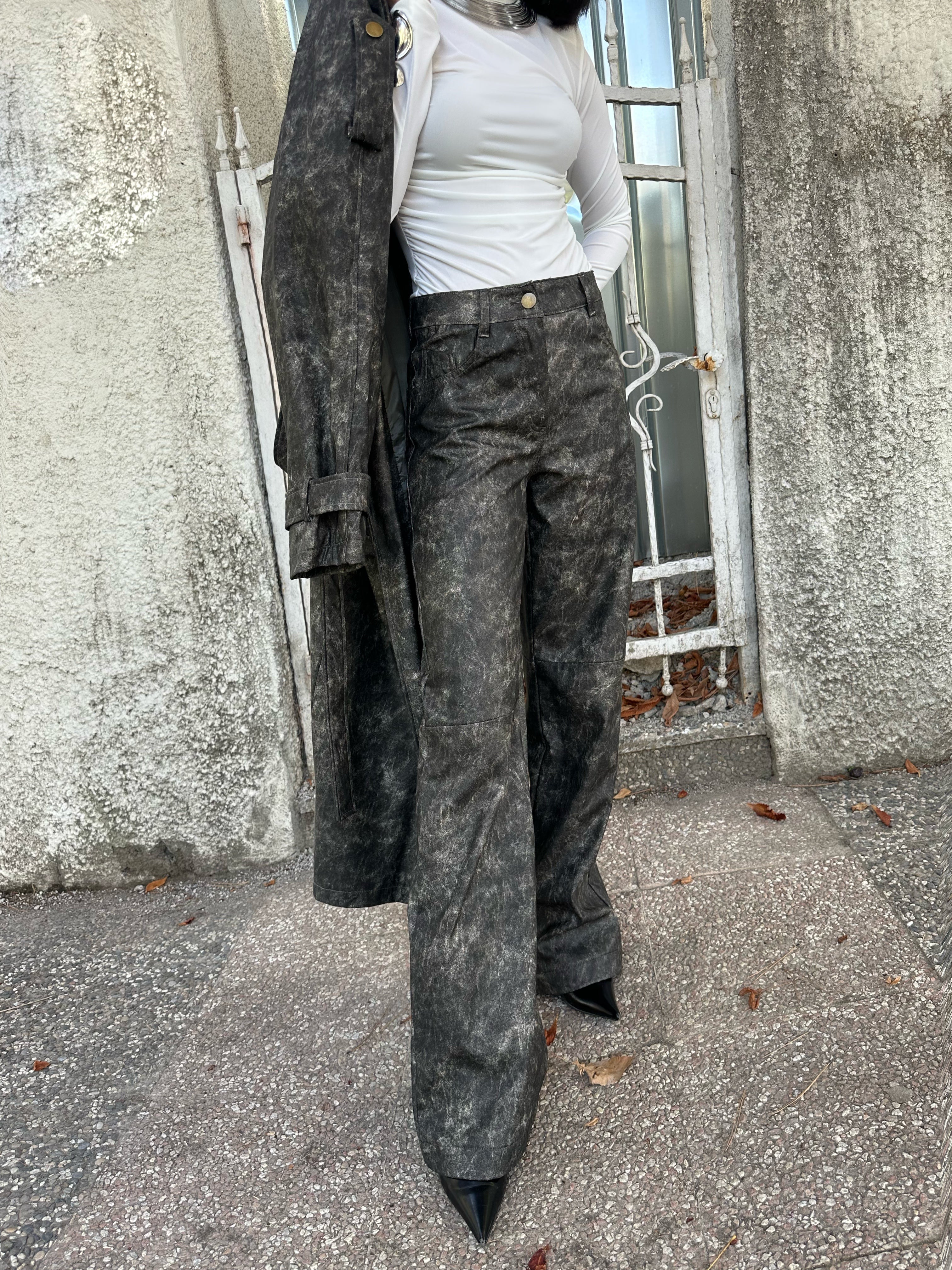 Ürün özellikleri: Yüksek bel, önden 2, arkadan 2 cepli, geniş paça palazzo deri pantolon.