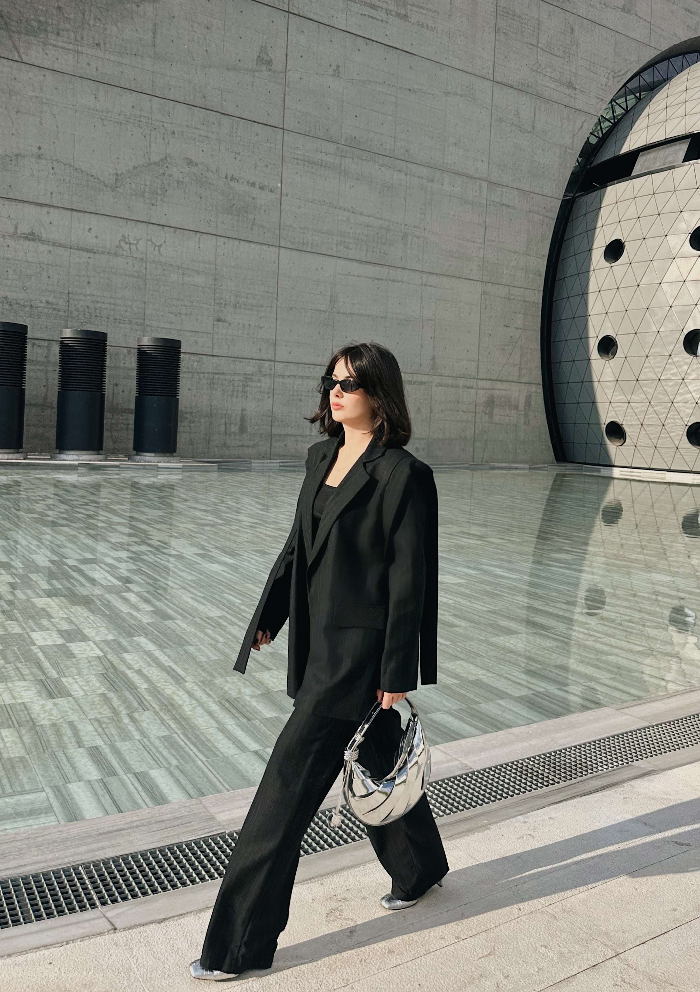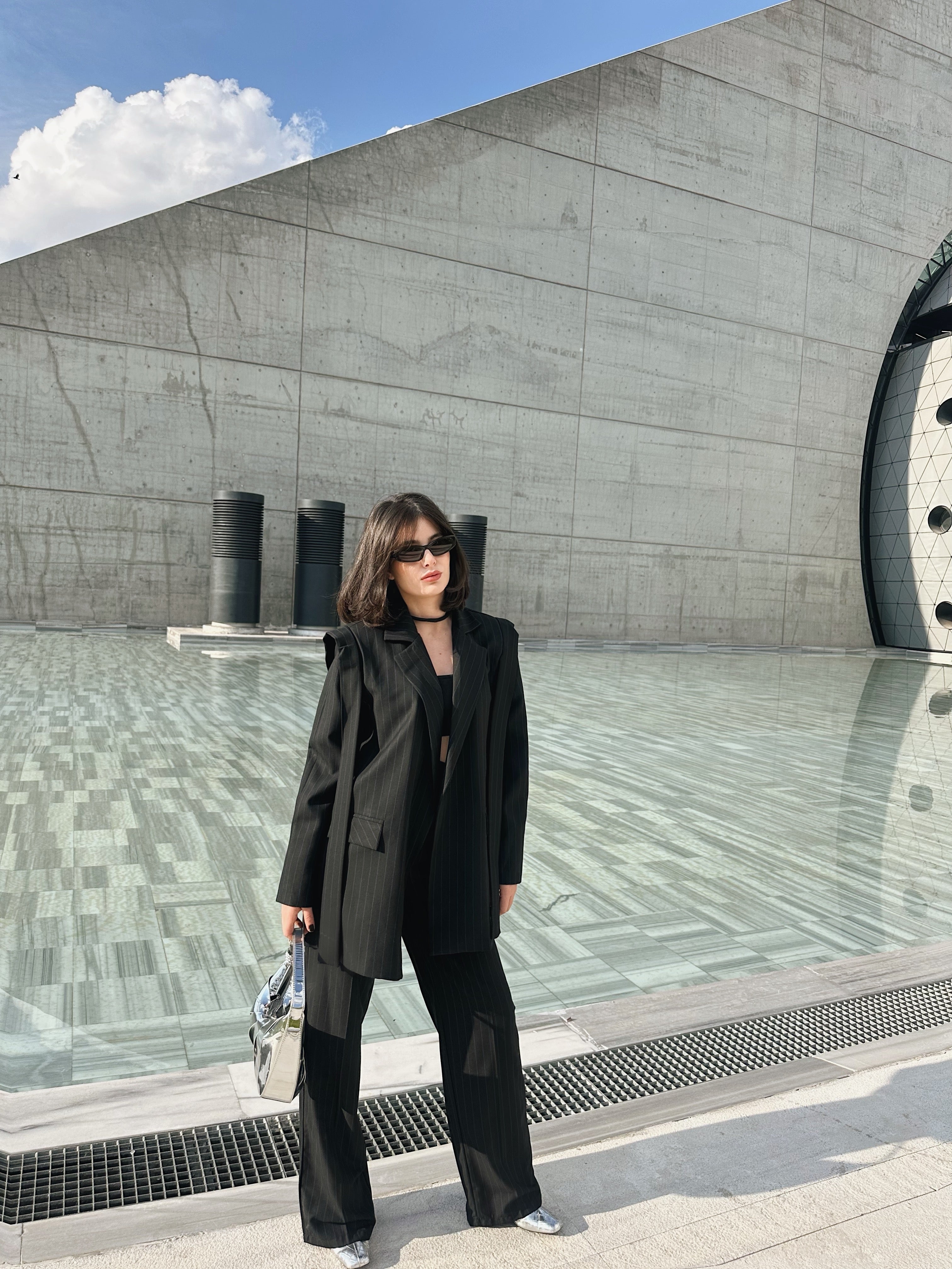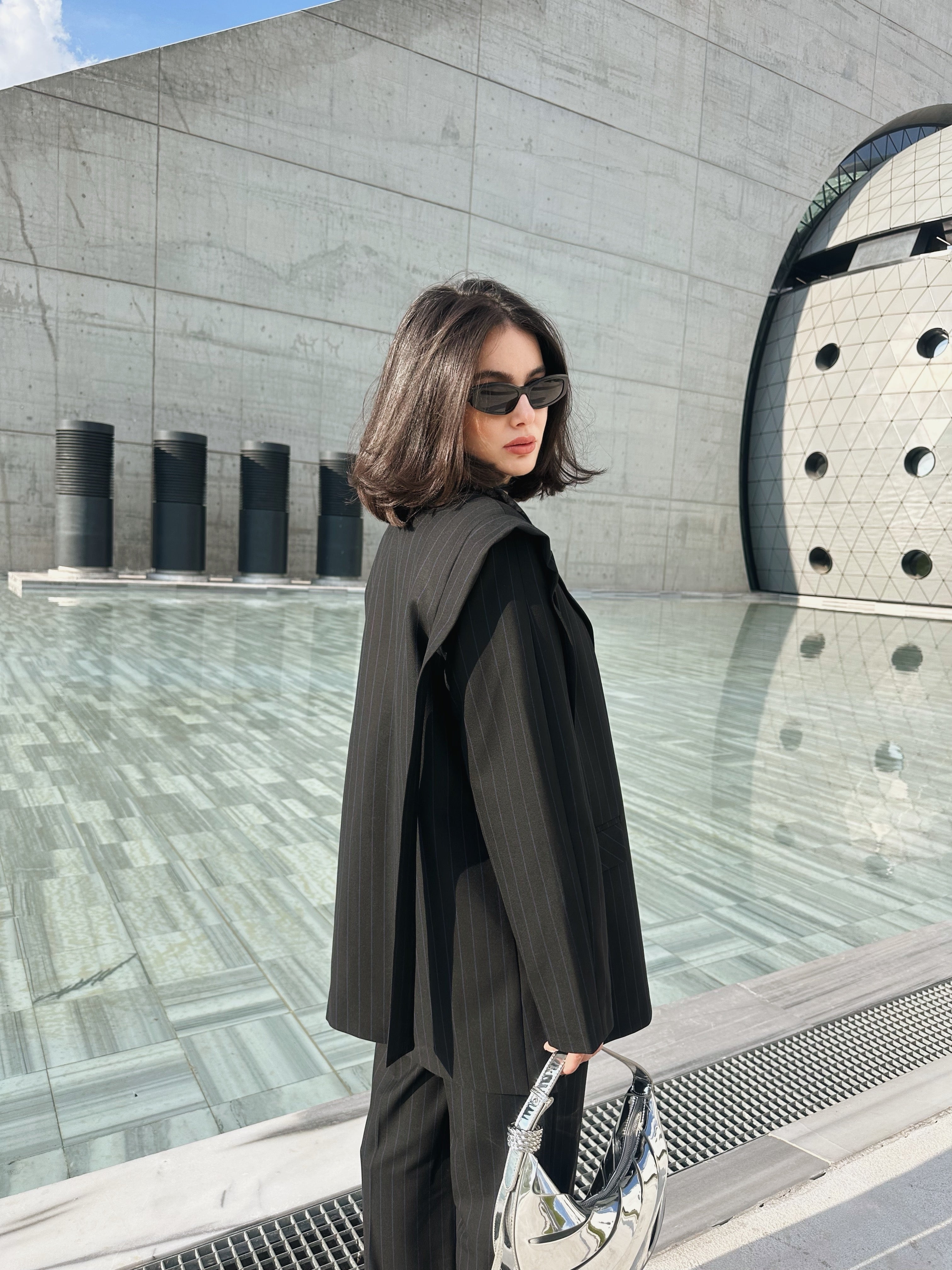 Ürün özellikleri: Oversize kesimi rahat ,astarlı, vatkalı omuzları kuşak detaylı ,çift cepli ,ip kemer detaylı çizgili ceket,palazzo pantolon takımı.