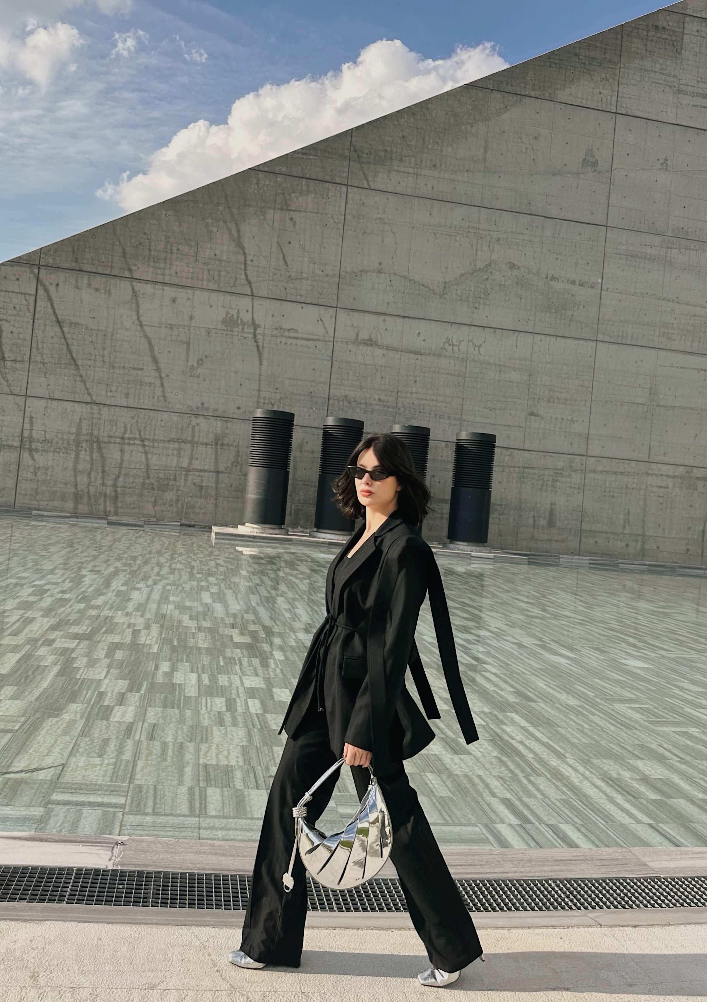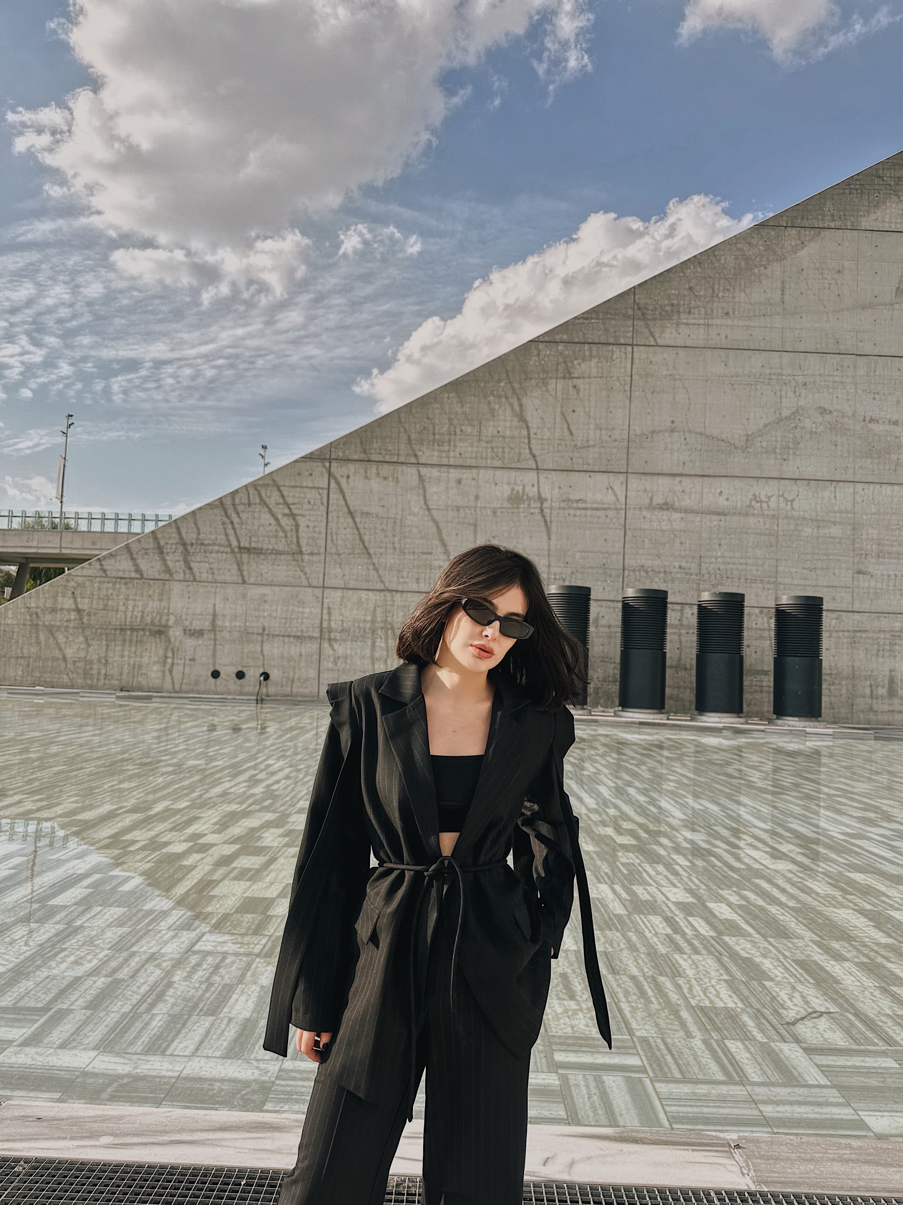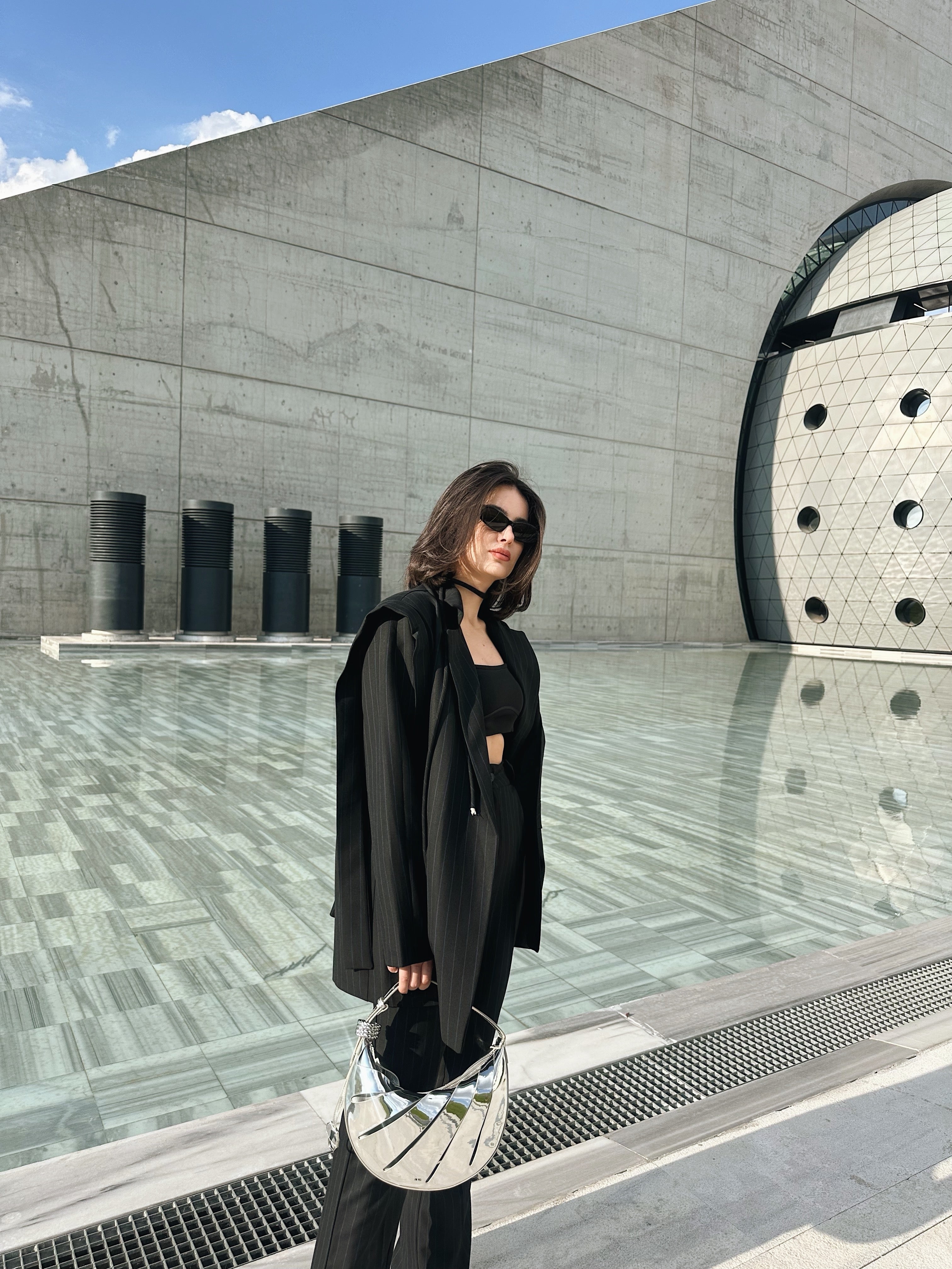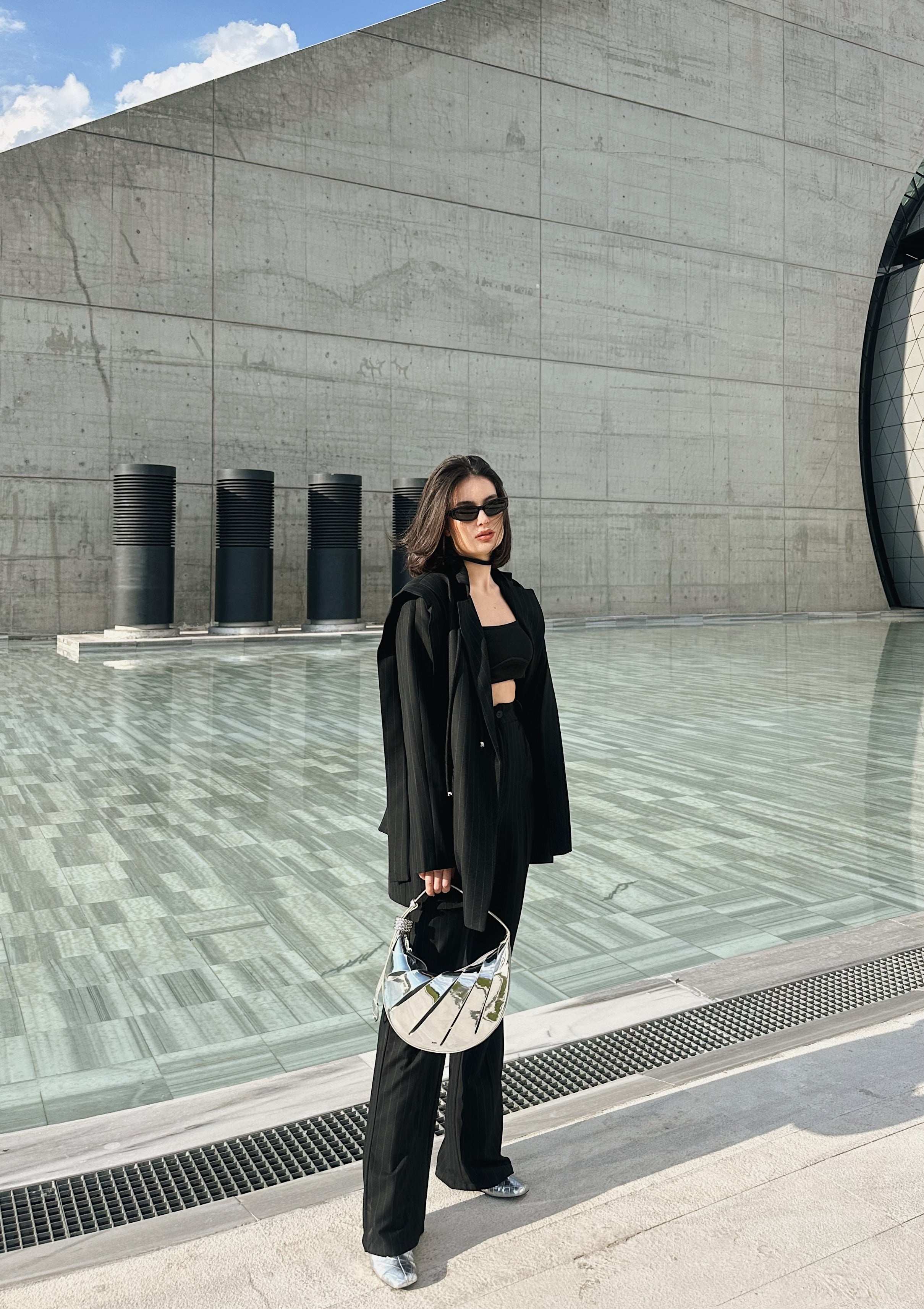 Ürün özellikleri: Oversize kesimi rahat ,astarlı, vatkalı omuzları kuşak detaylı ,çift cepli ,ip kemer detaylı çizgili ceket,palazzo pantolon takımı.