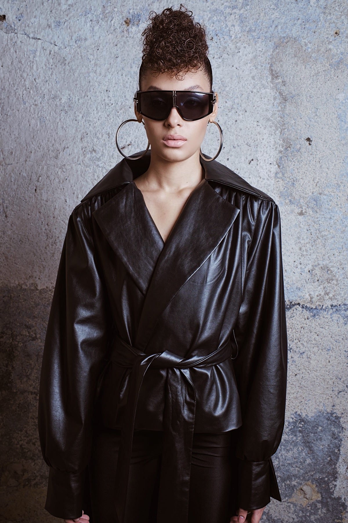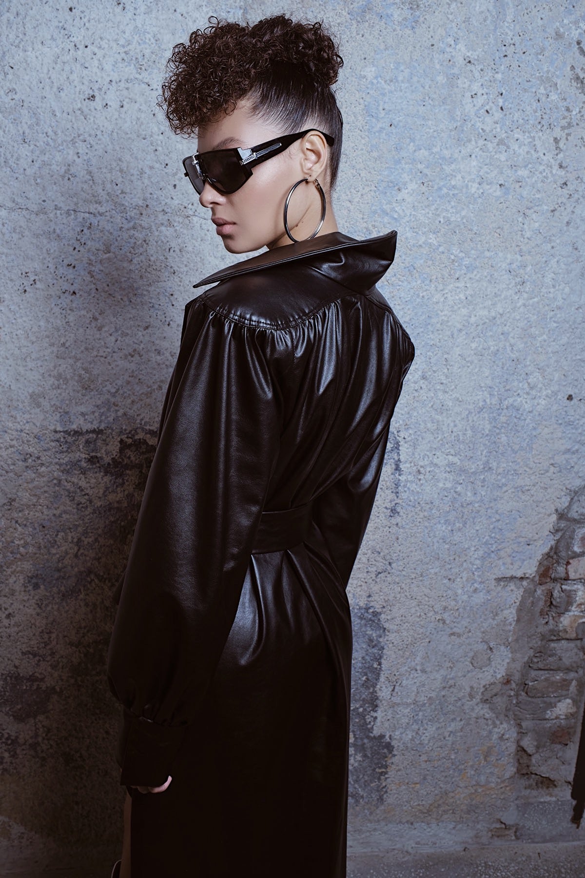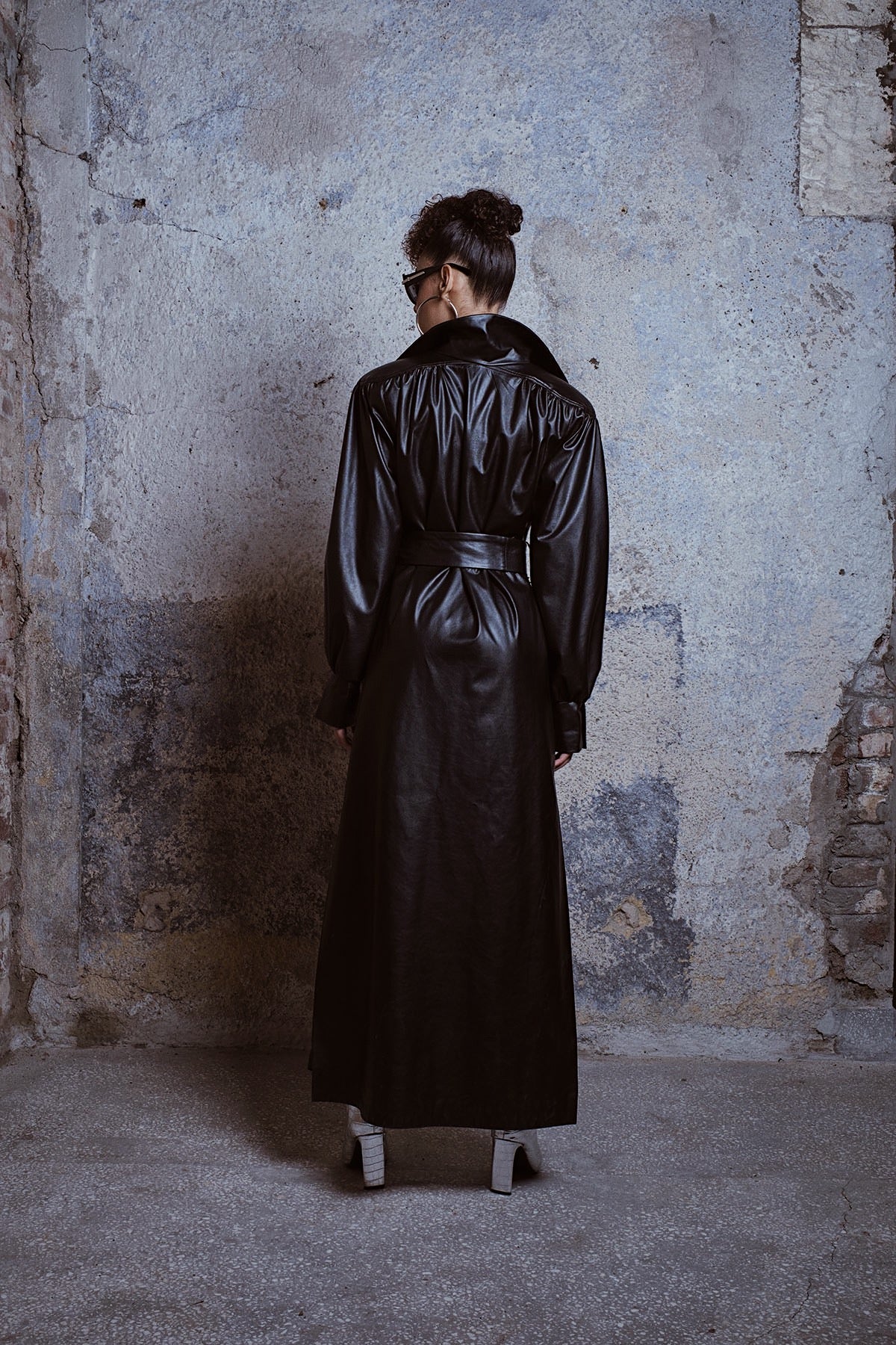 Produktmerkmale: Übergroßer Trenchcoat aus weißem Leder mit plissierten Schulterpolstern, breitem Kragen, Ballonärmeln, kurzer Vorderseite und langem Gürtel hinten. Das Produkt ist gefüttert.