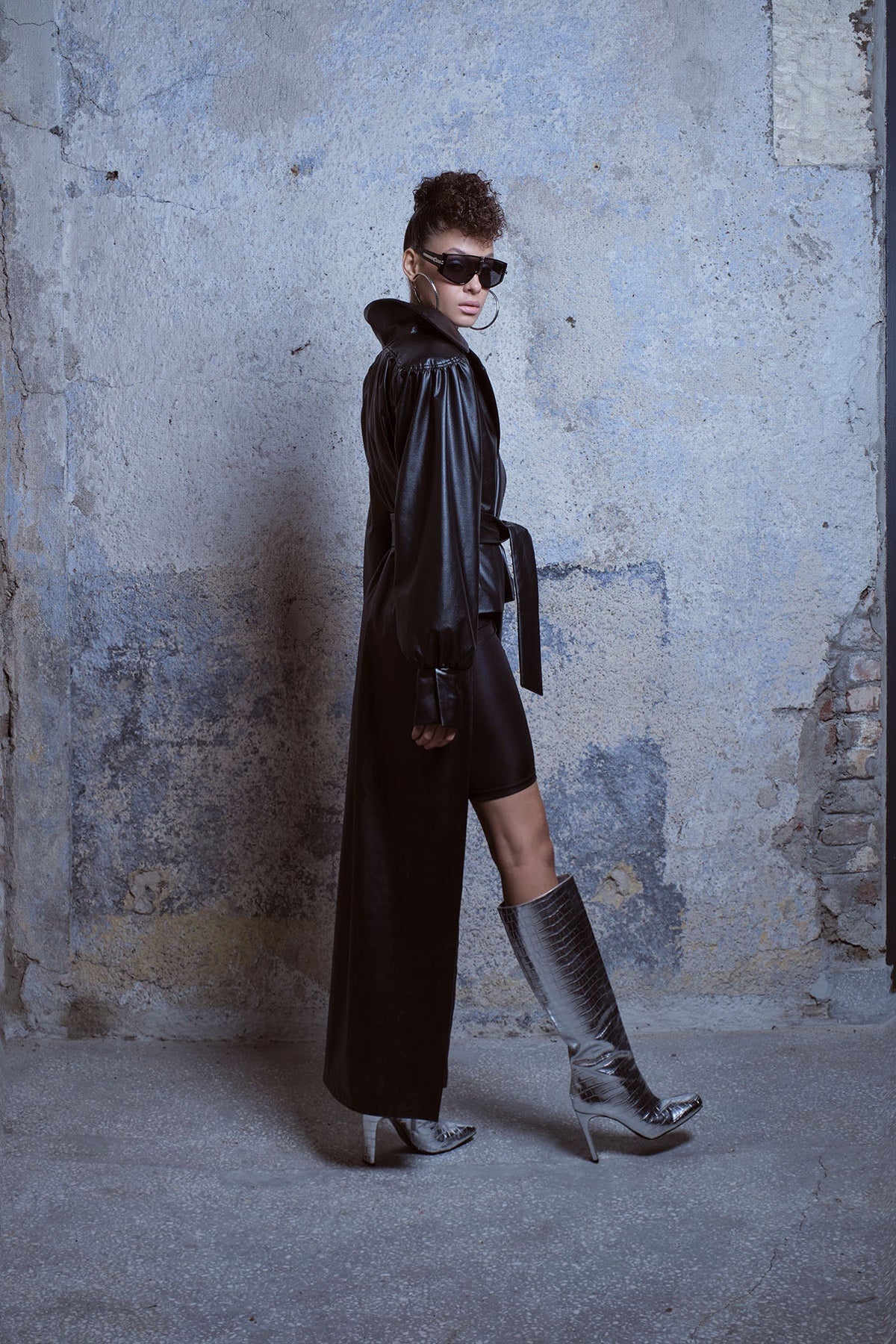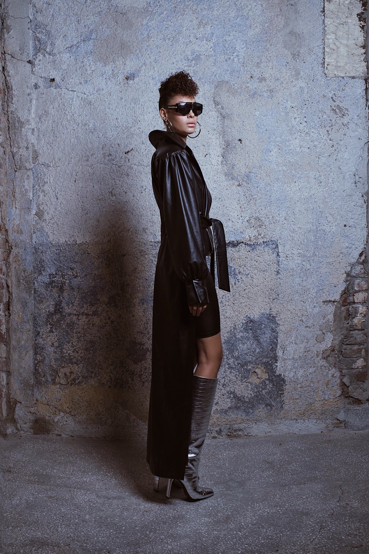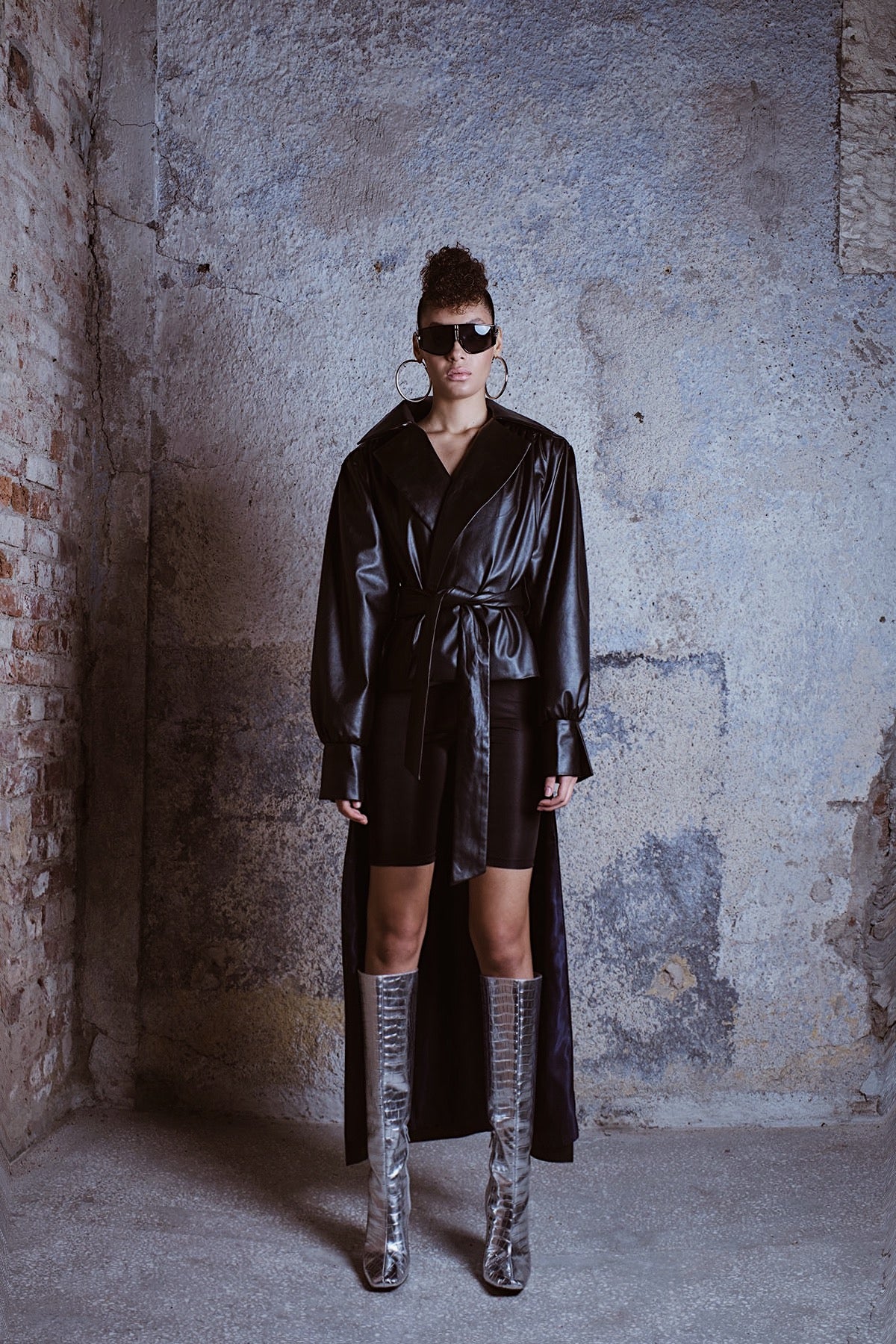Produktmerkmale: Übergroßer Trenchcoat aus weißem Leder mit plissierten Schulterpolstern, breitem Kragen, Ballonärmeln, kurzer Vorderseite und langem Gürtel hinten. Das Produkt ist gefüttert.