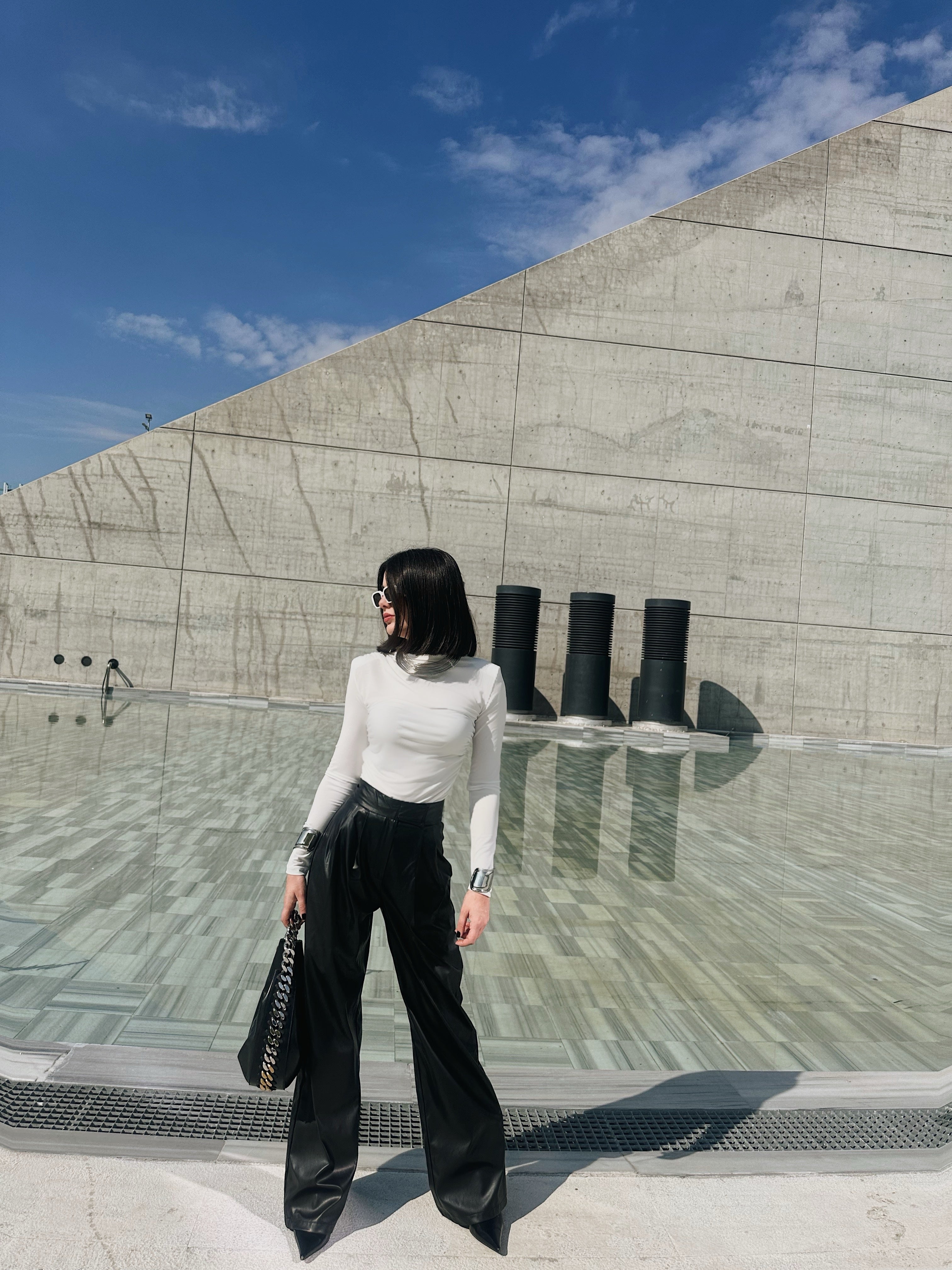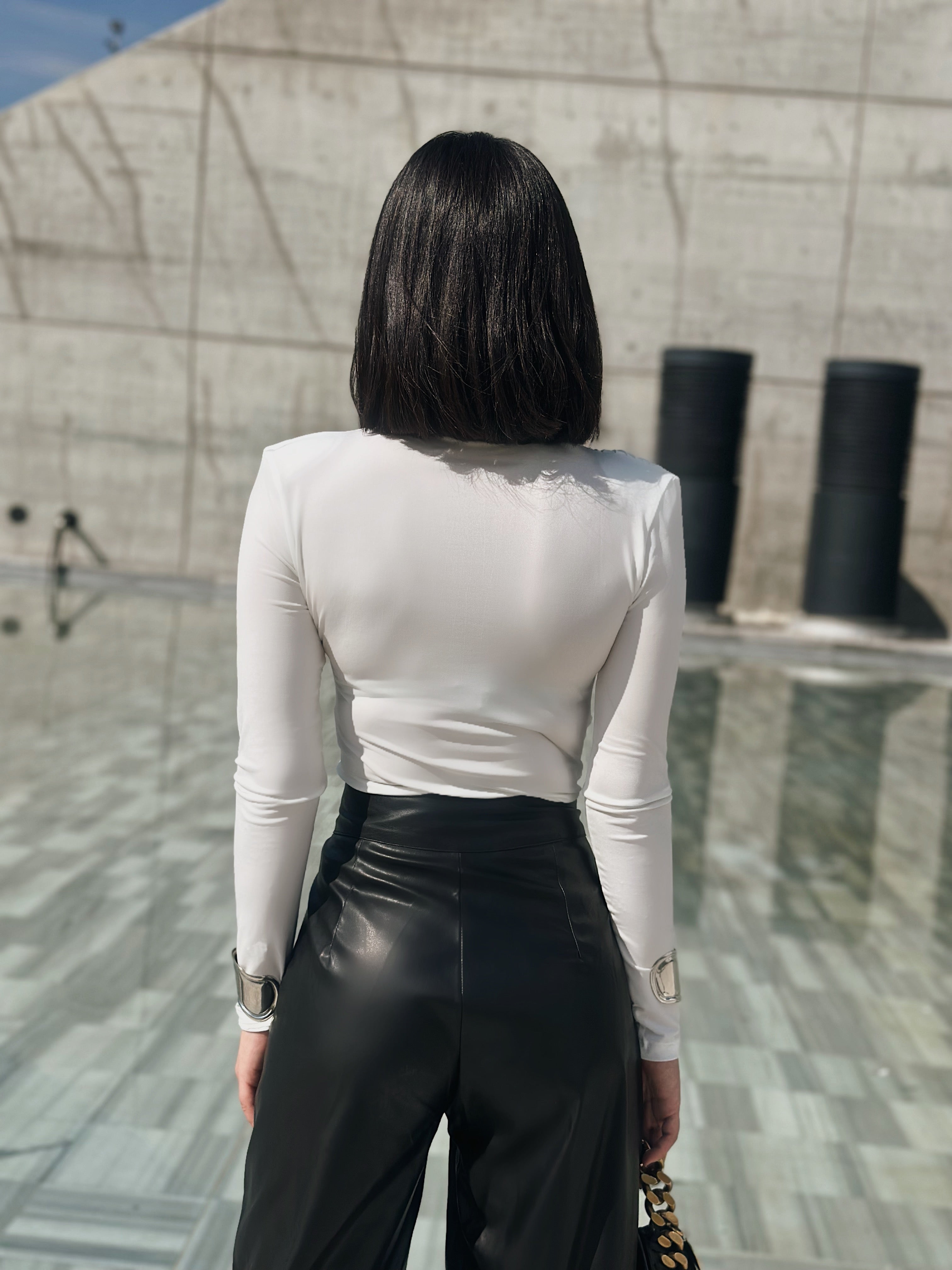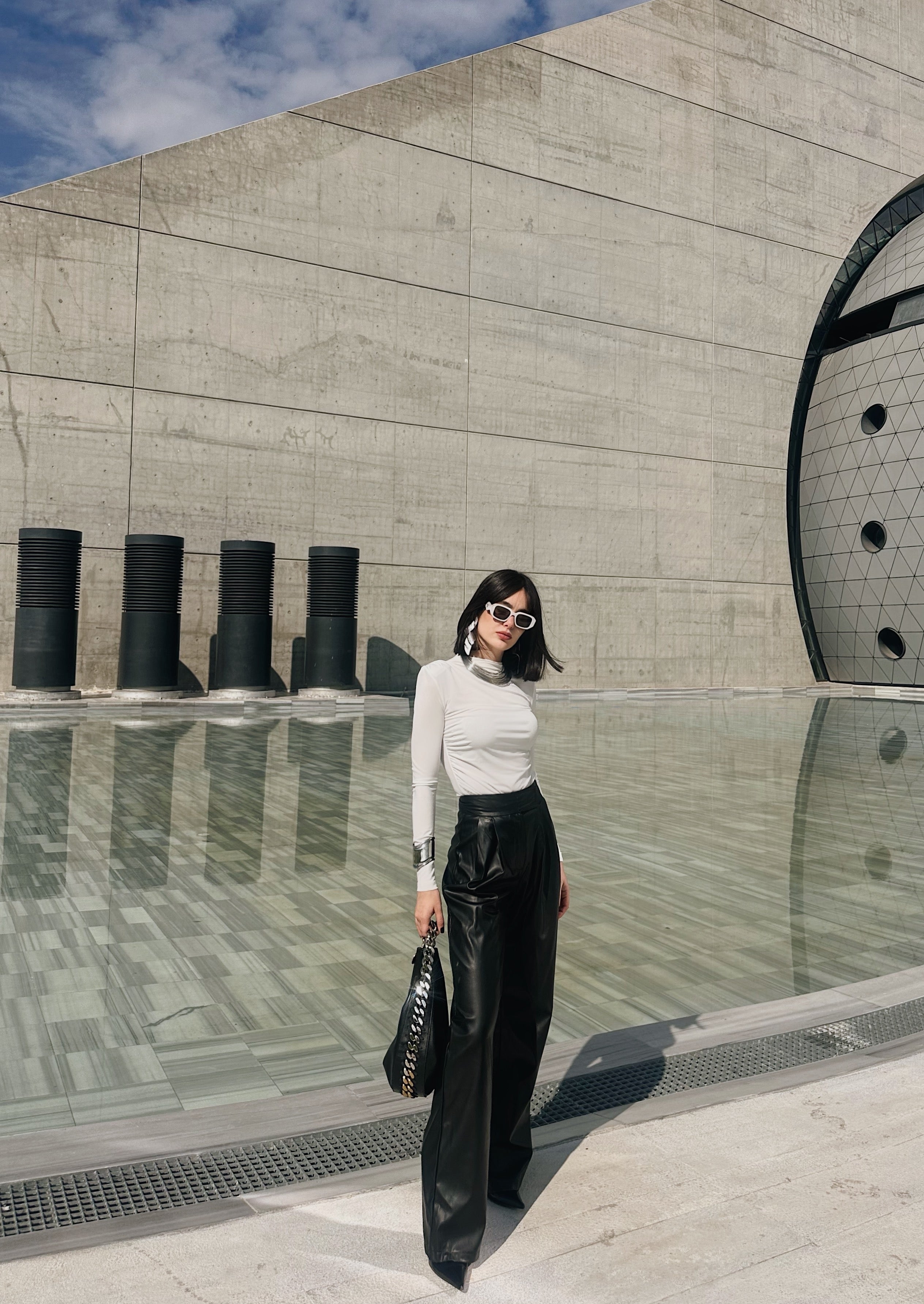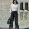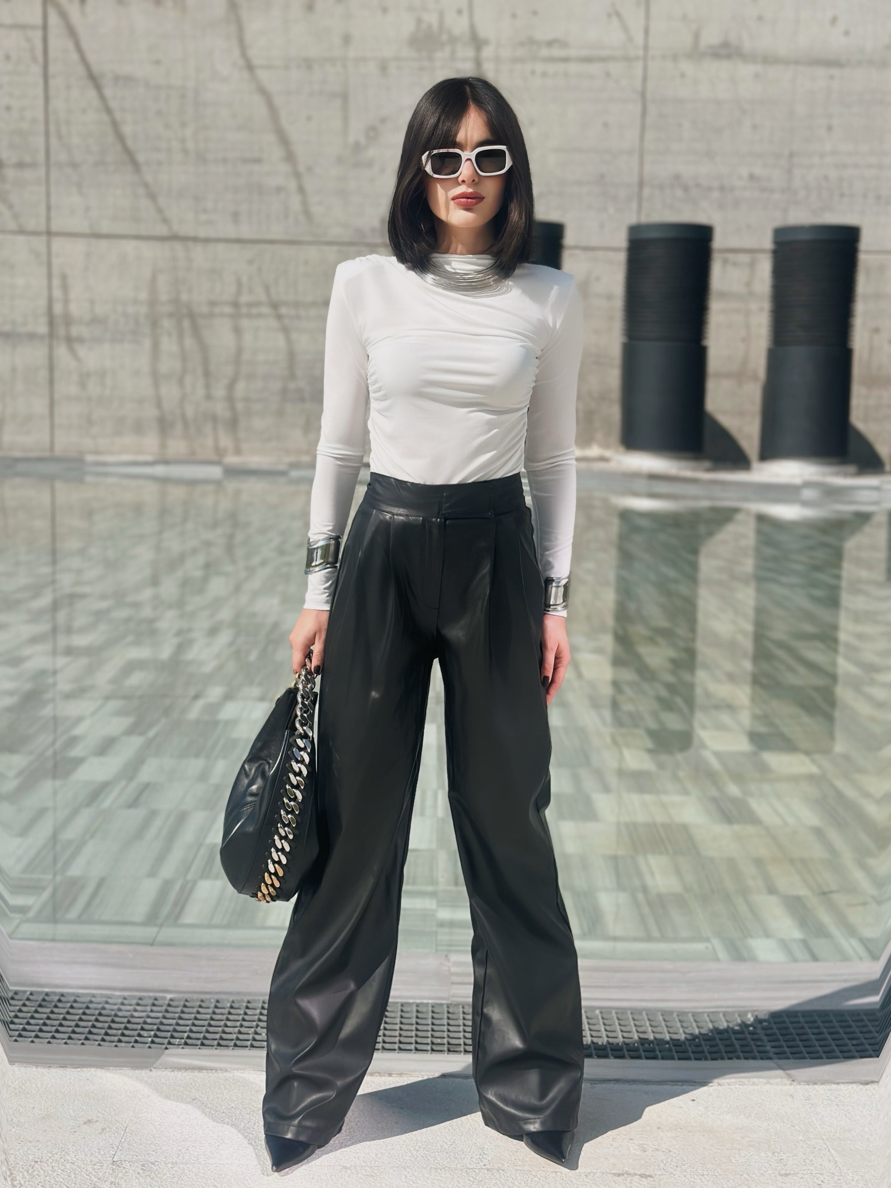 Ürün özellikleri: Yüksek bel ,pileli yandan cepli ,önü cırtcırt açımalı suni deri geniş paça pantolon
