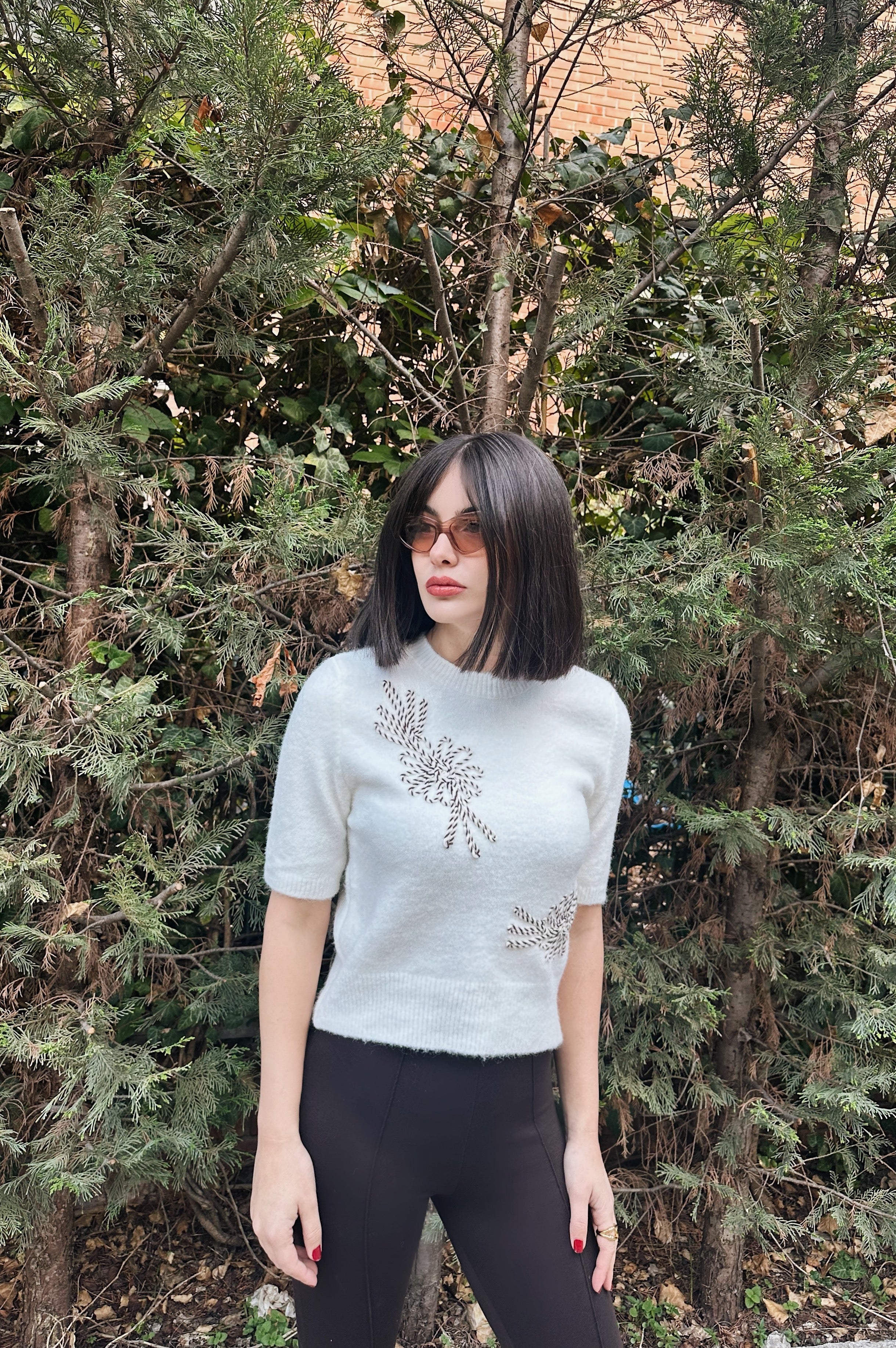 Ürün özellikleri: Yarım kollu ,nakış detaylı yün kazak.