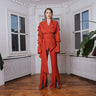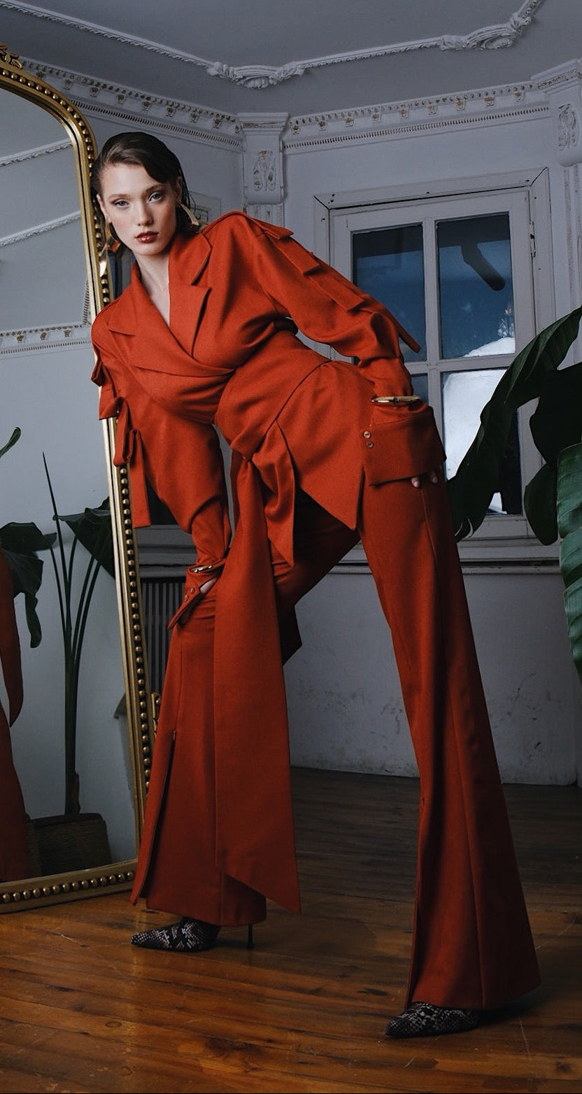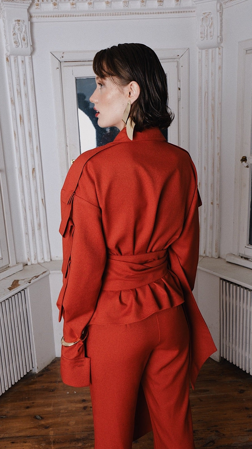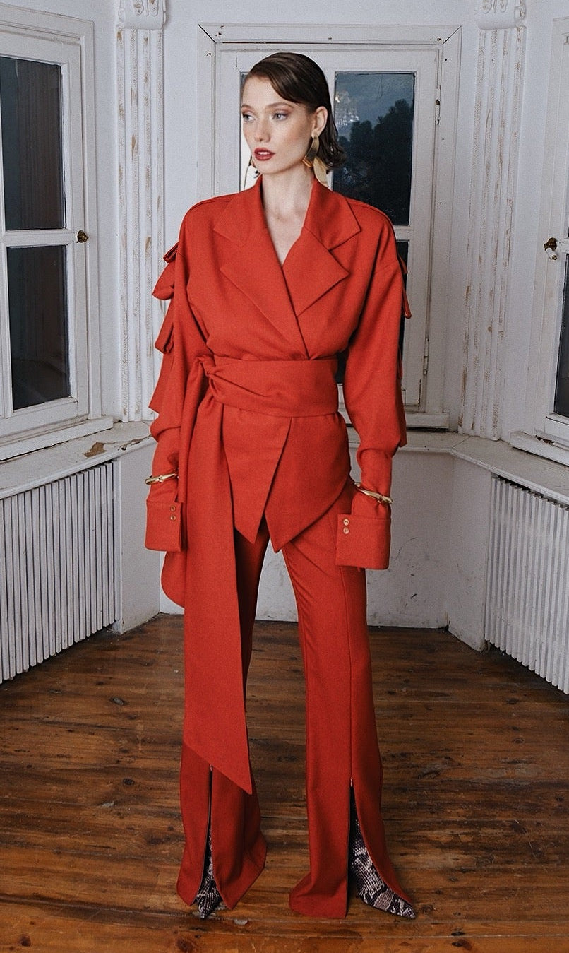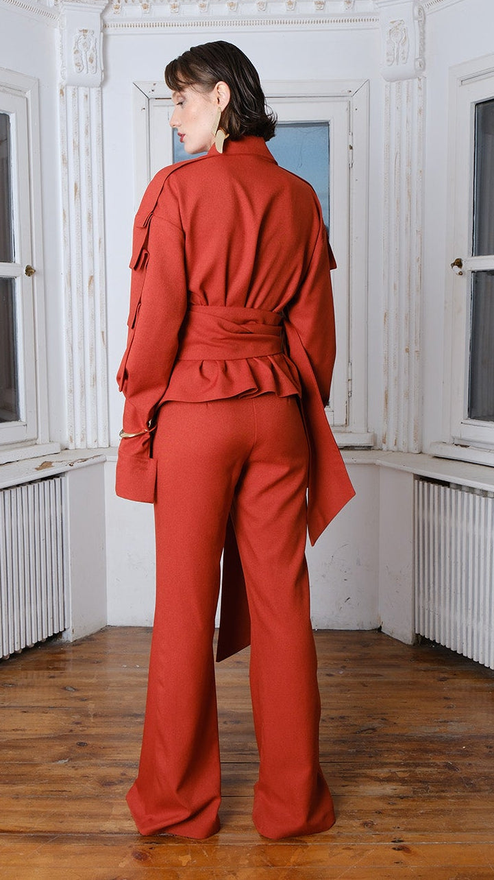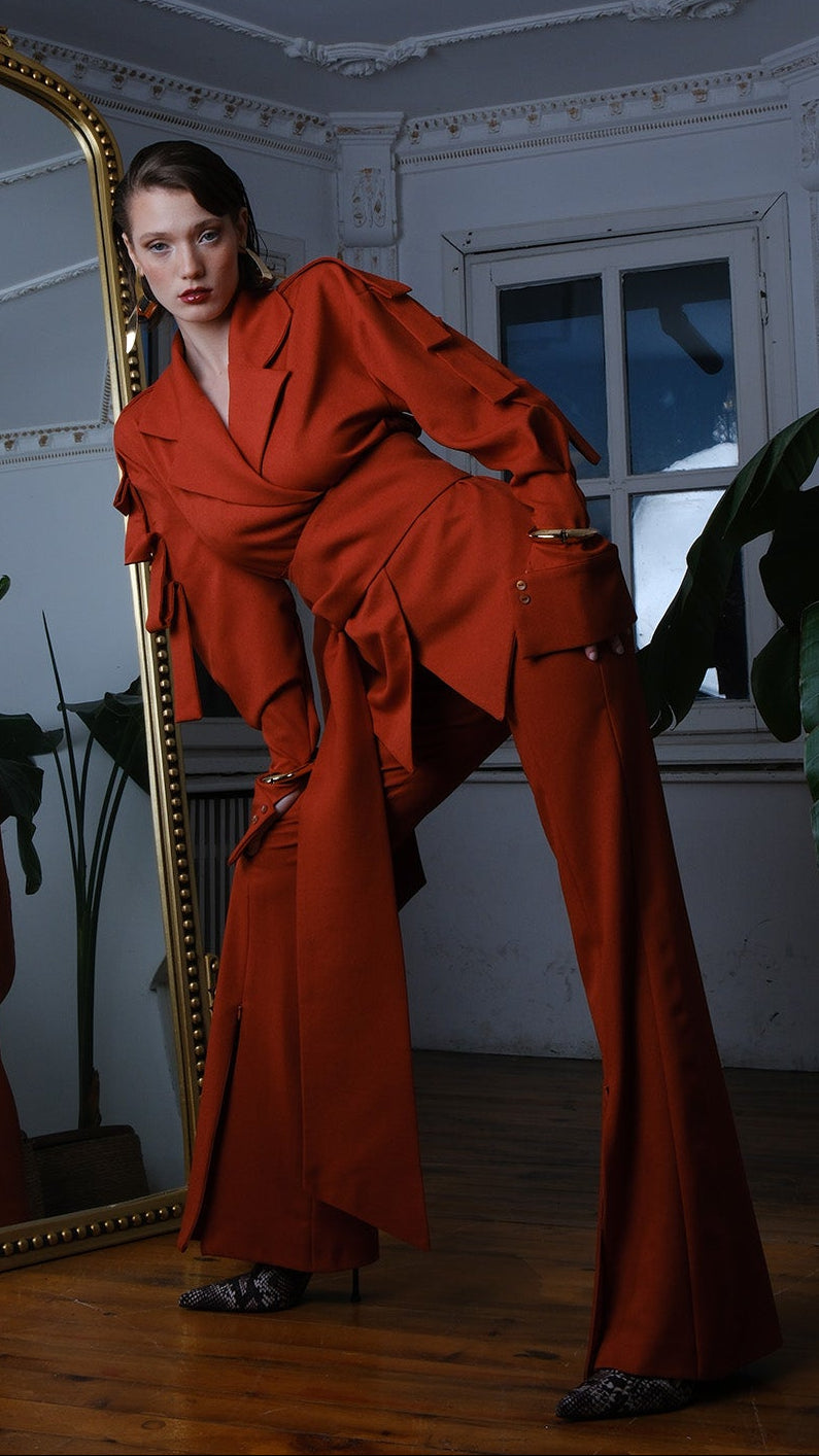 Product features: Flared trousers with slit detail and zipper at the hem, a jacket with a thick belt at the waist and detailed collar and sleeves. Sold as a set.