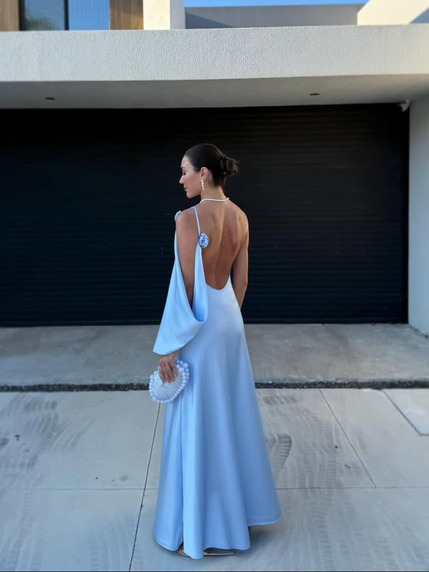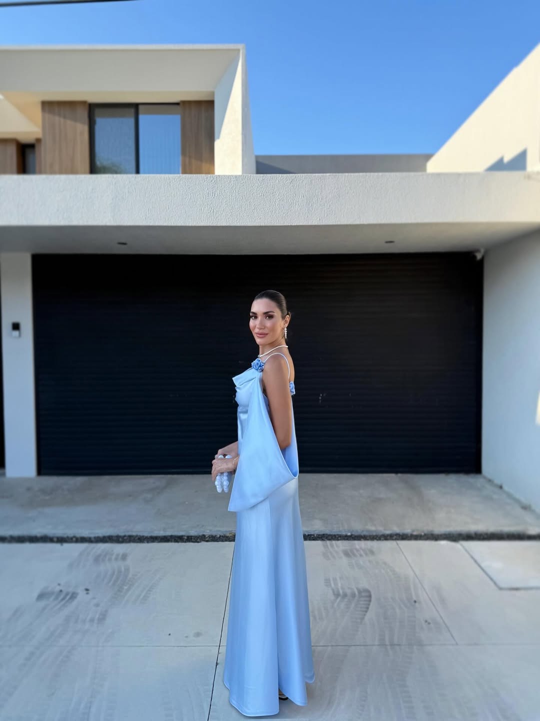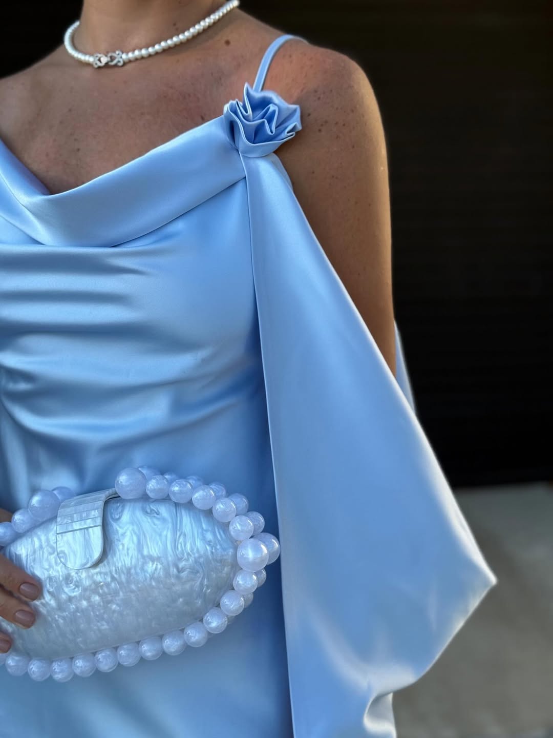 It is completed with a fixed shawl and rose detail on the shoulder.