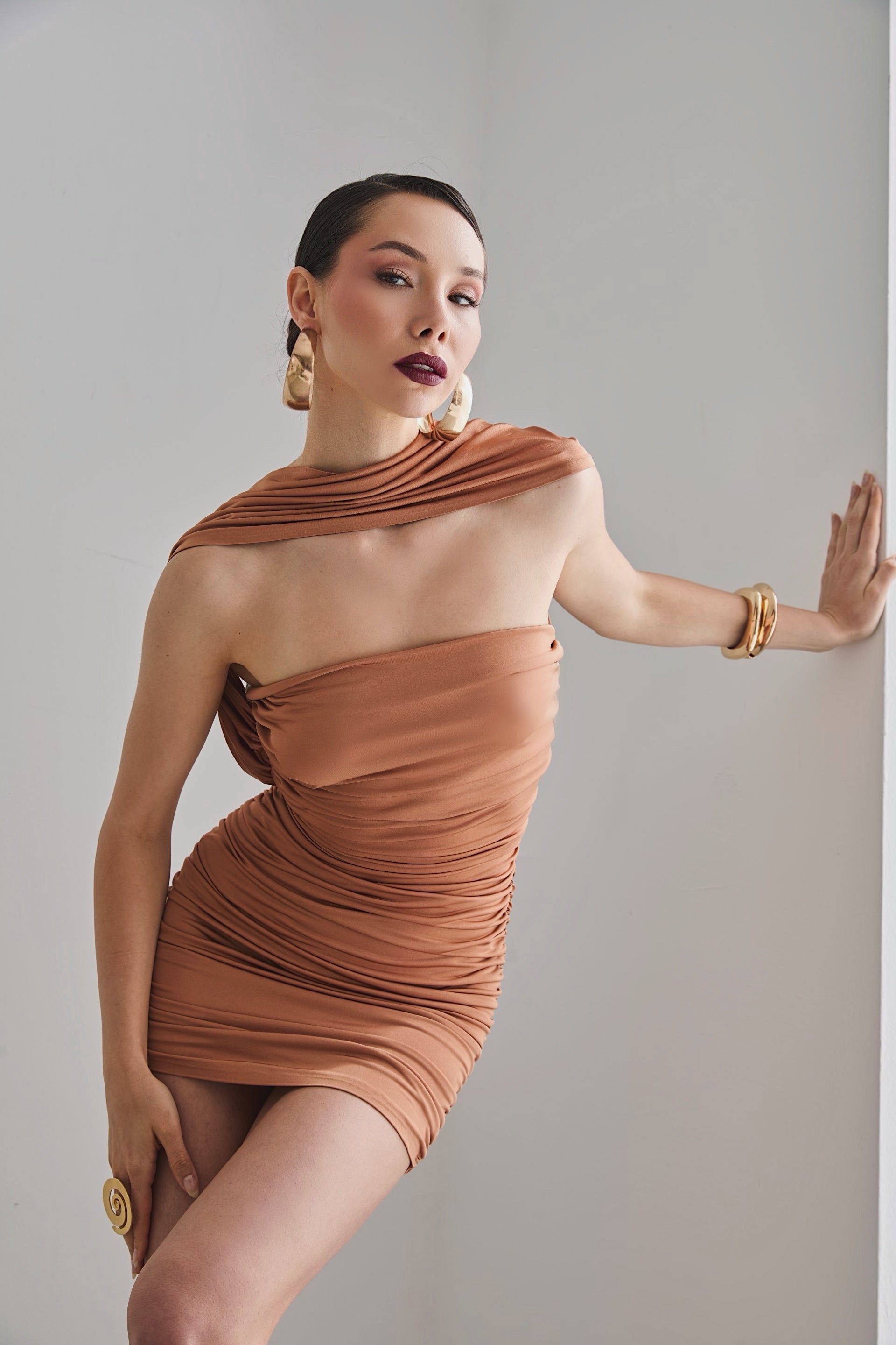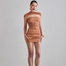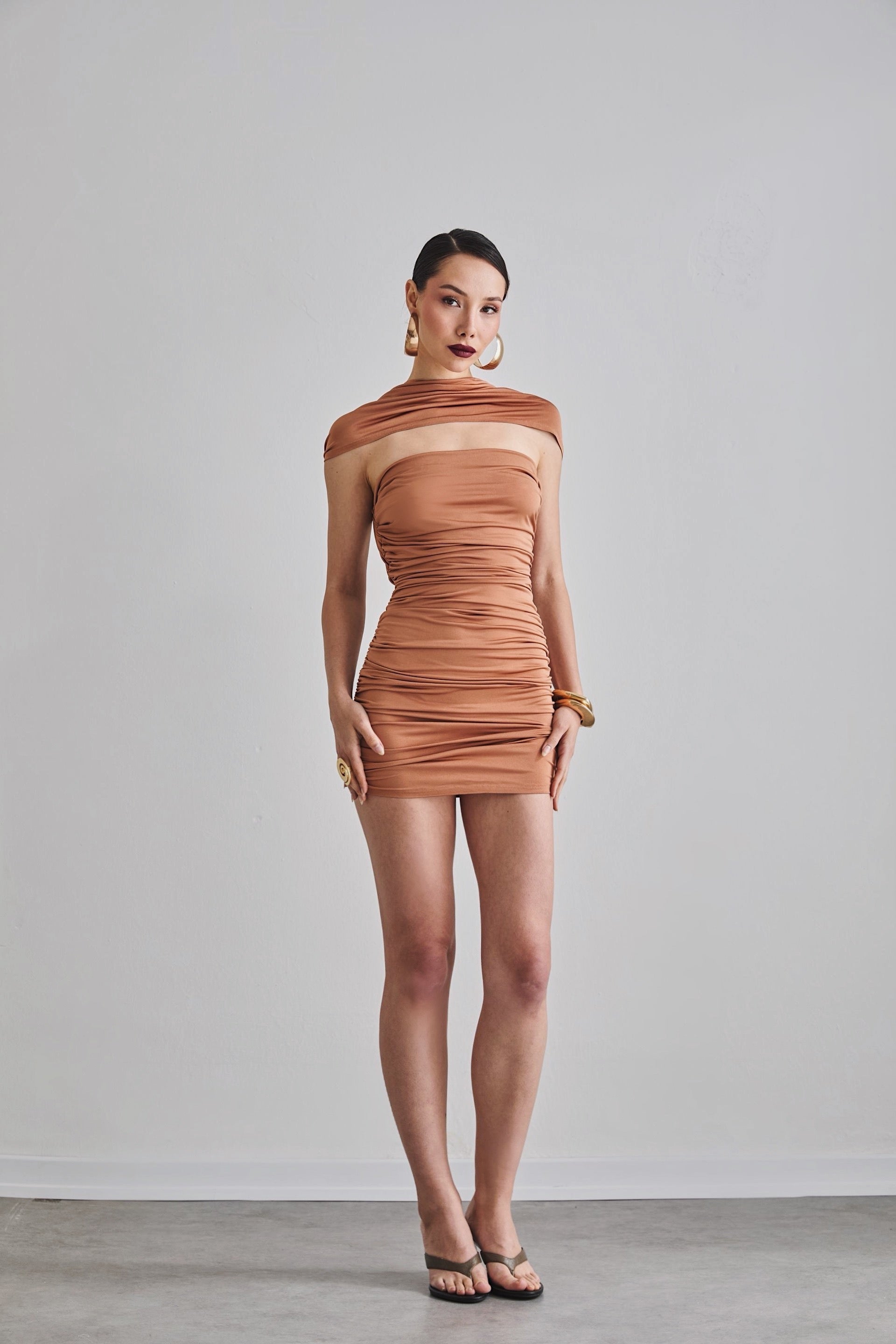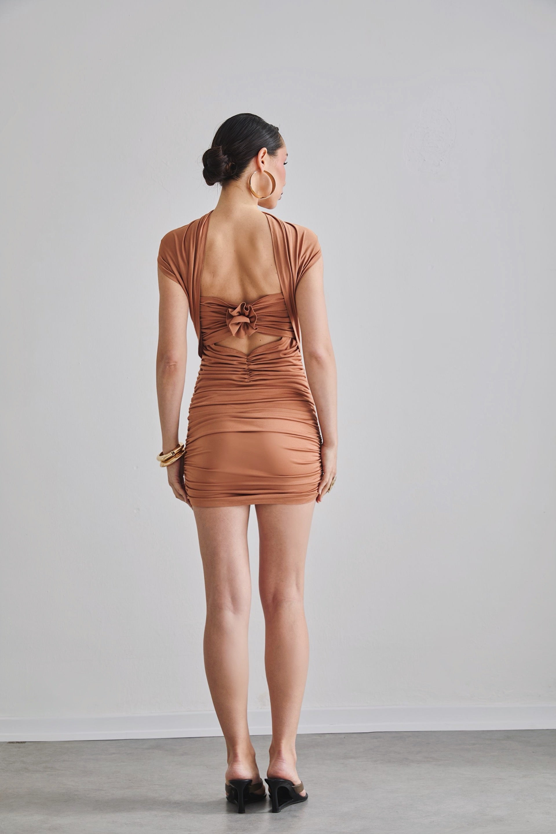 Draped mini dress with a low back, rose detail and shawl transition from the shoulder.
