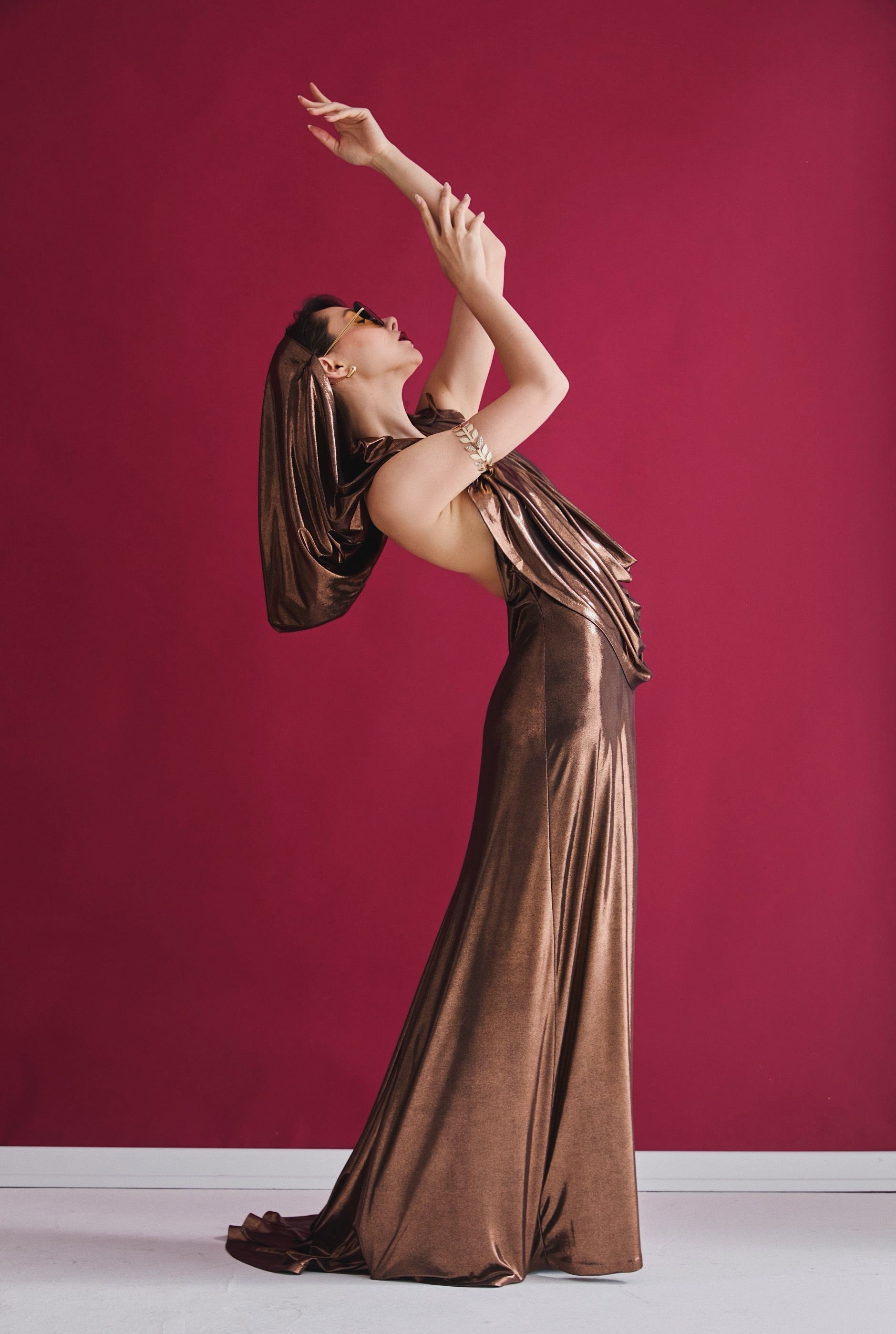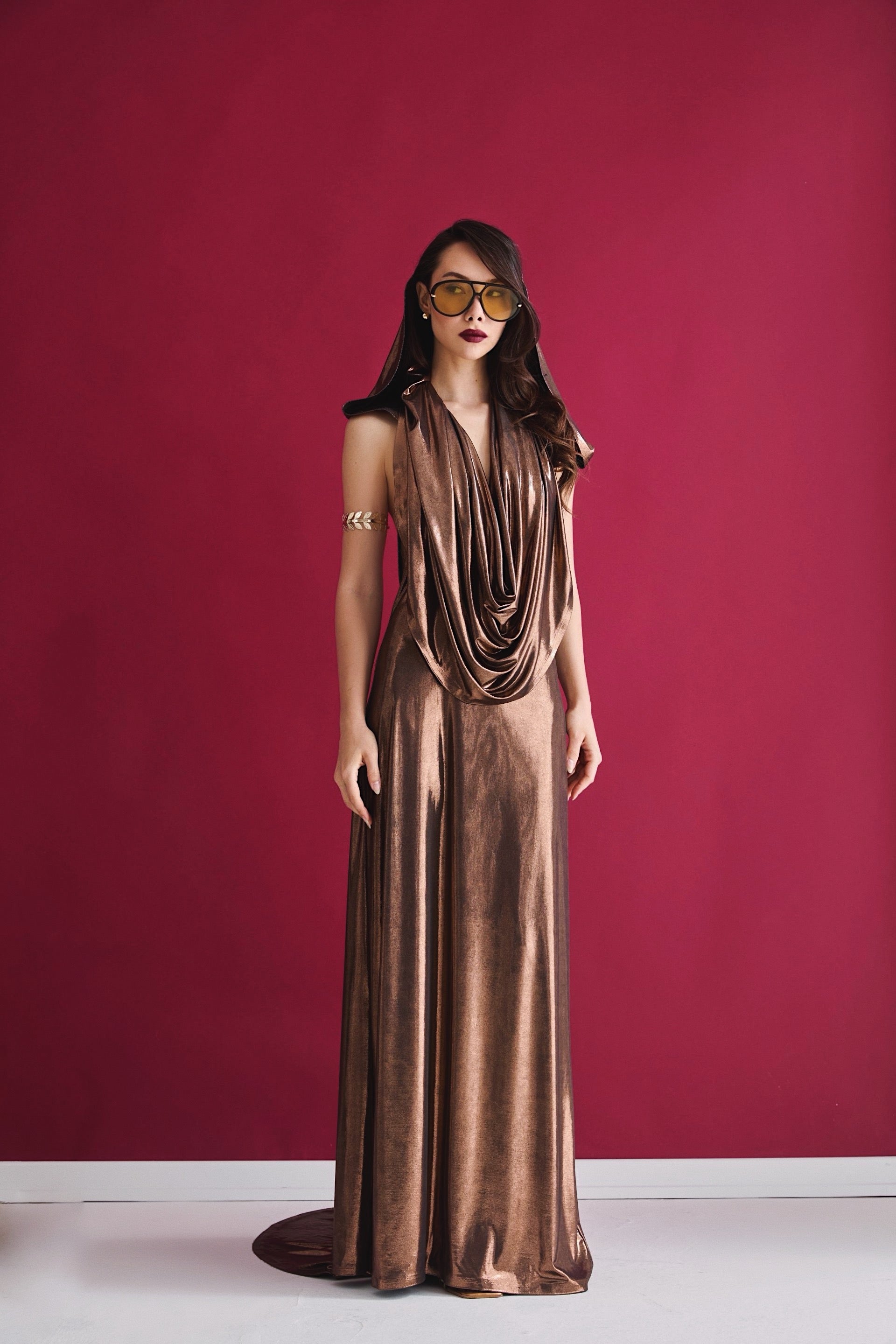 Long shiny lycra dress with a hood, low-cut back, cowl neck and train detail.