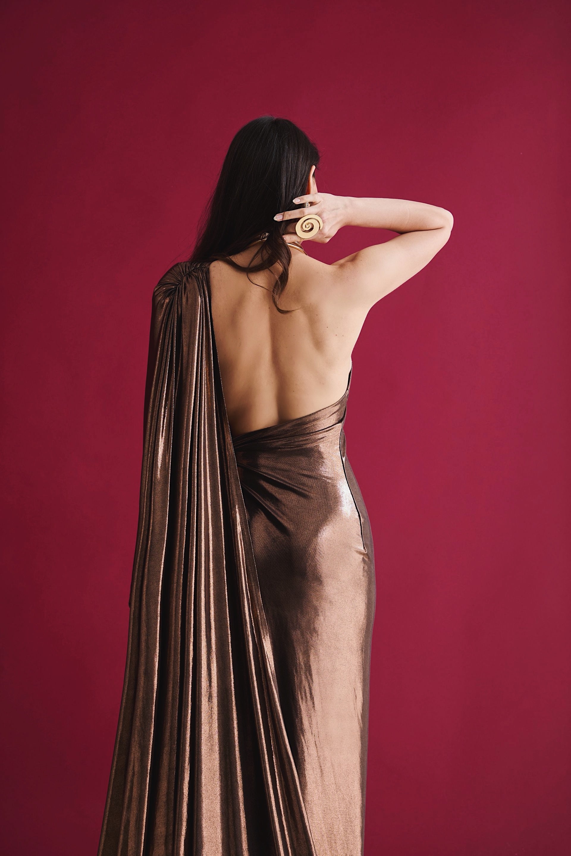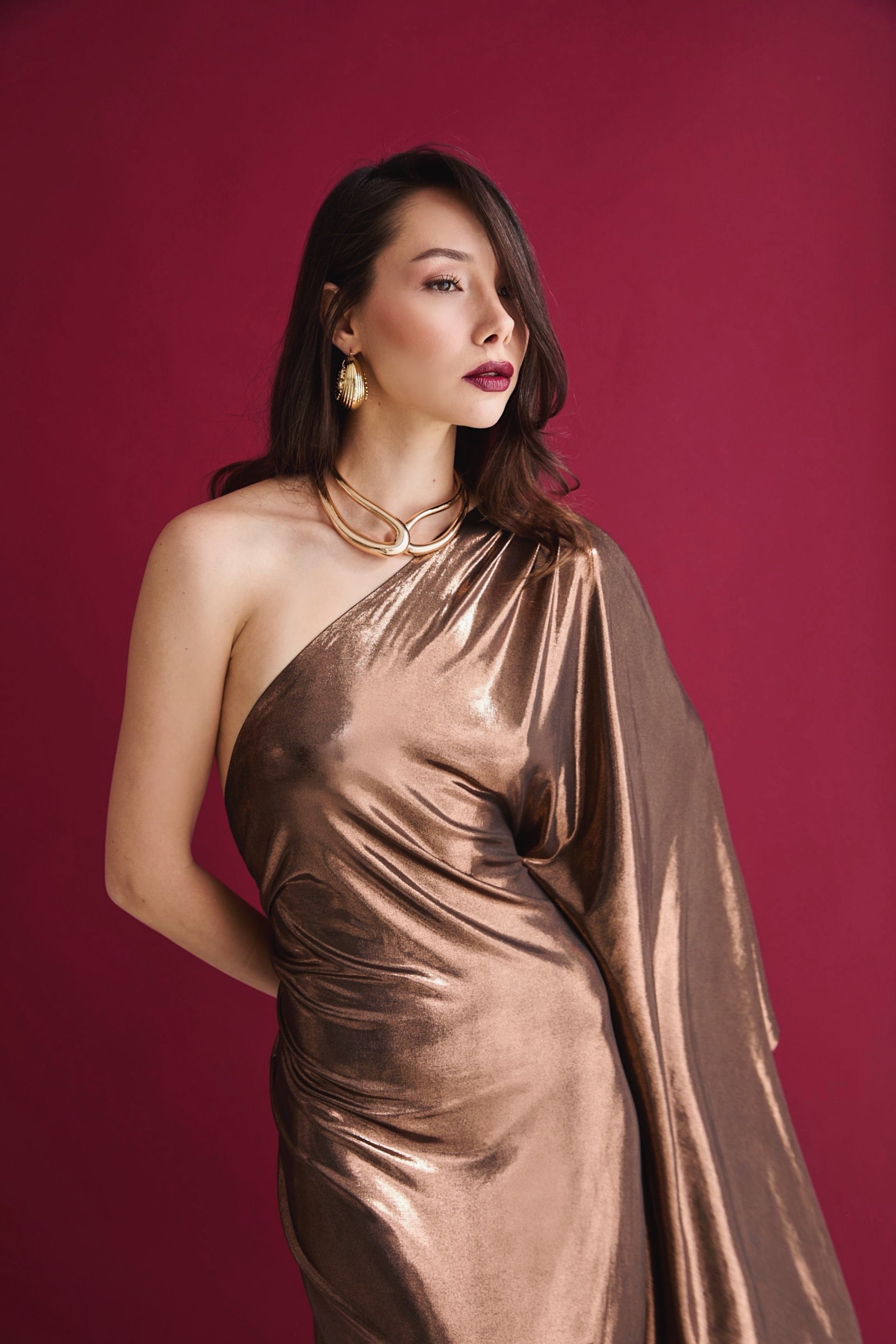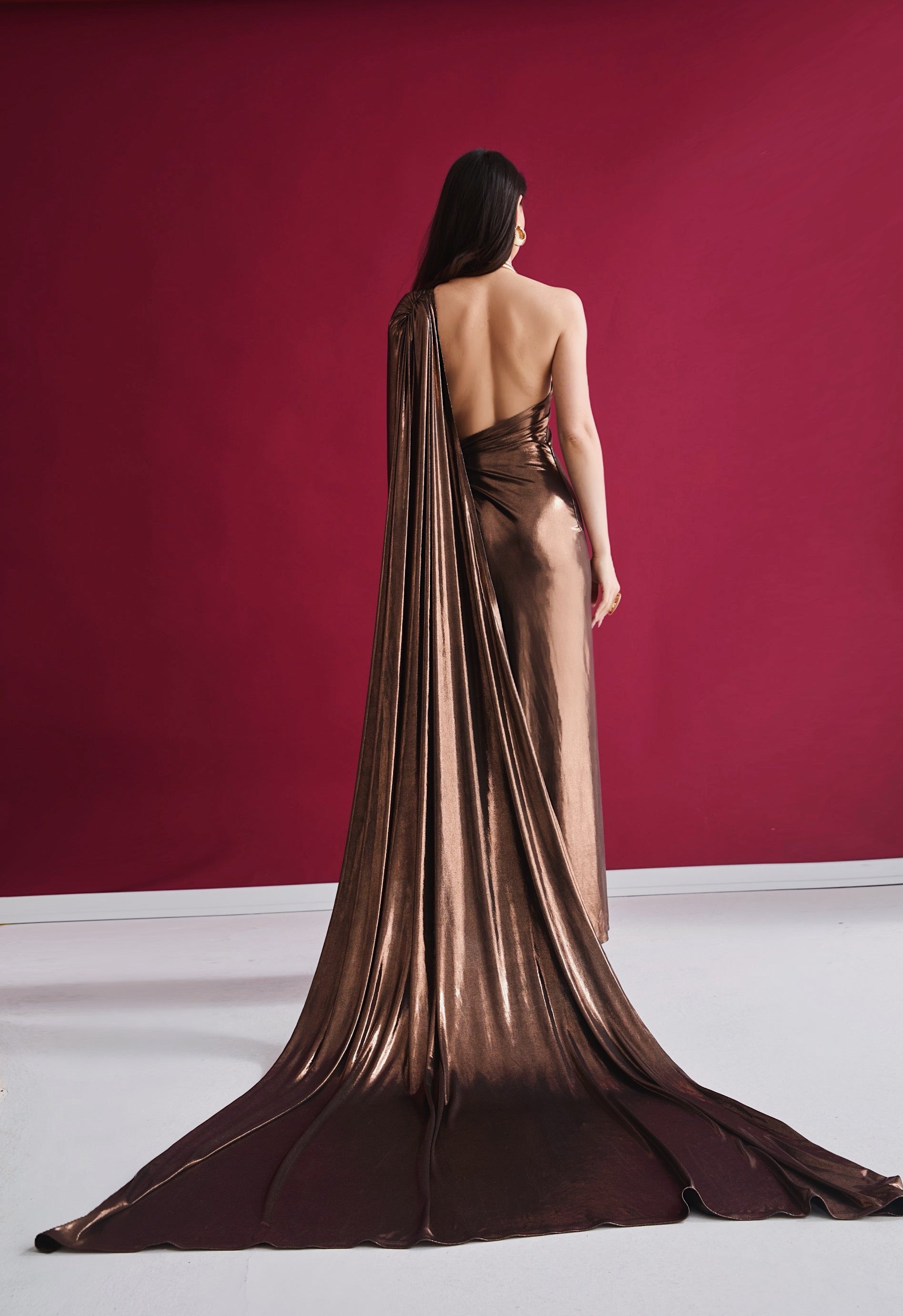 You can create a powerful, showy and stage-effective look by combining the Thalia dress with high heels and bronze-toned accessories.