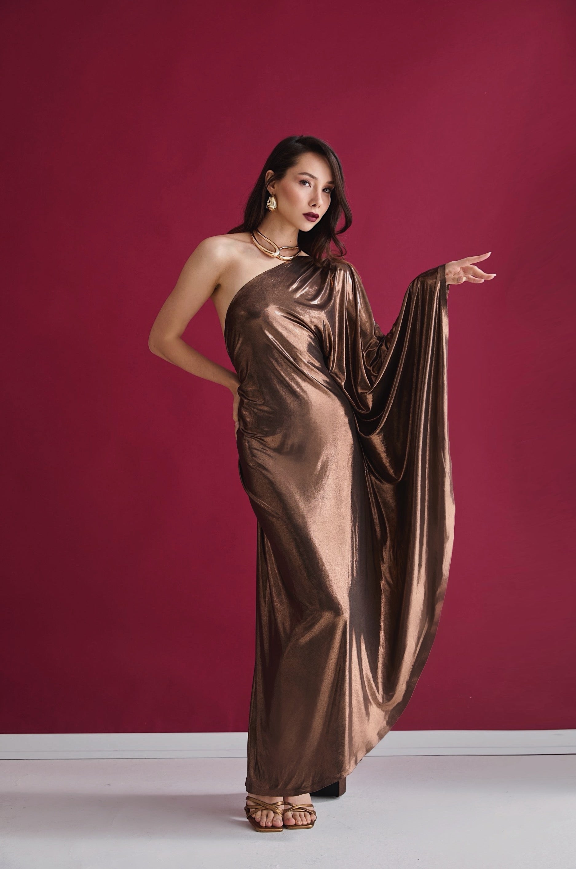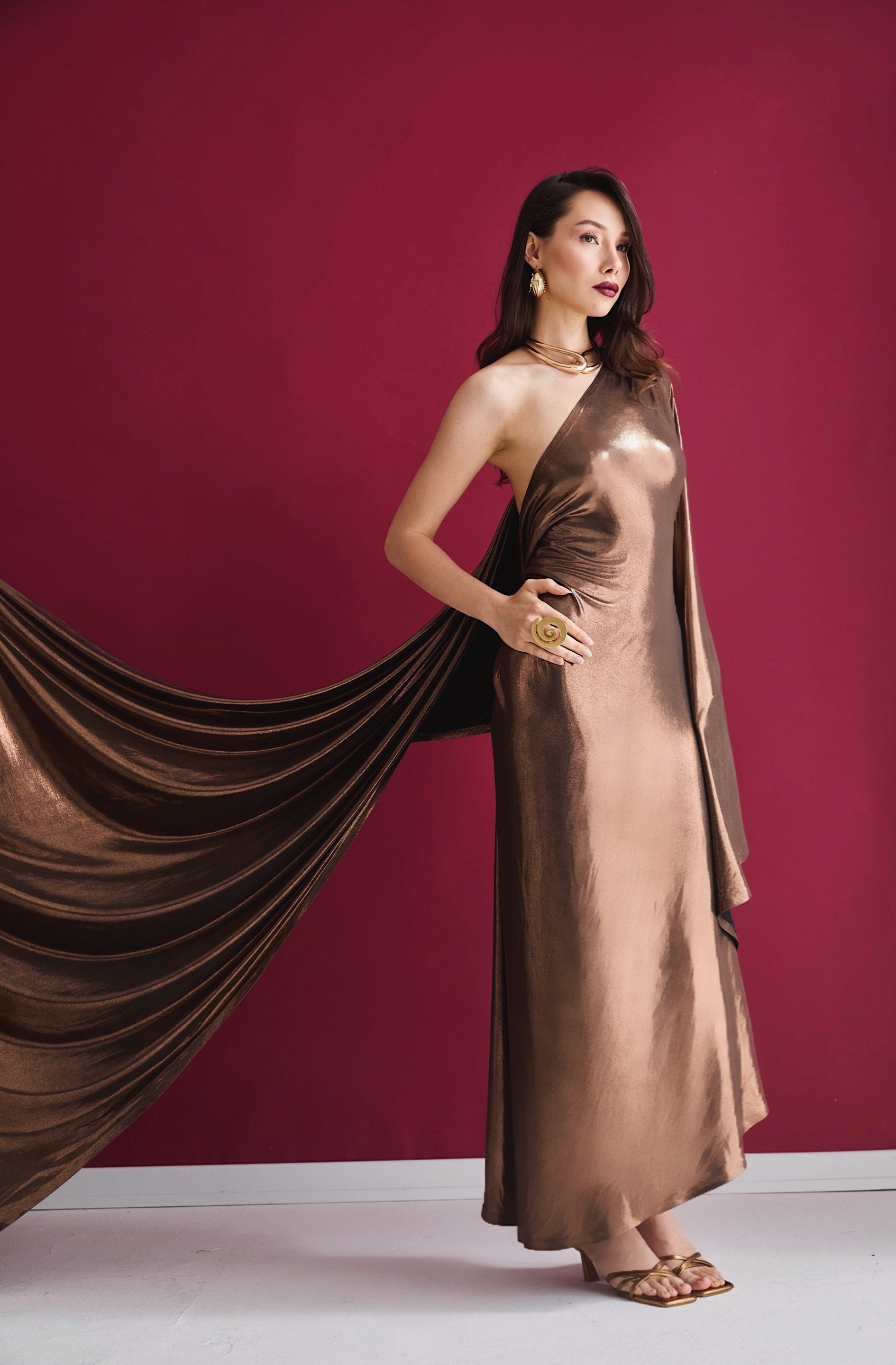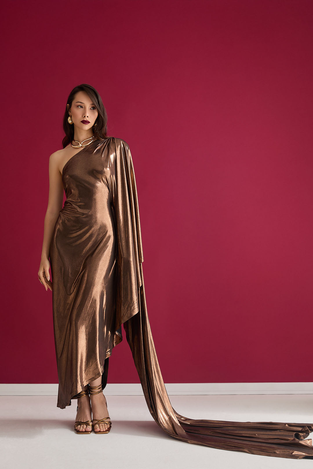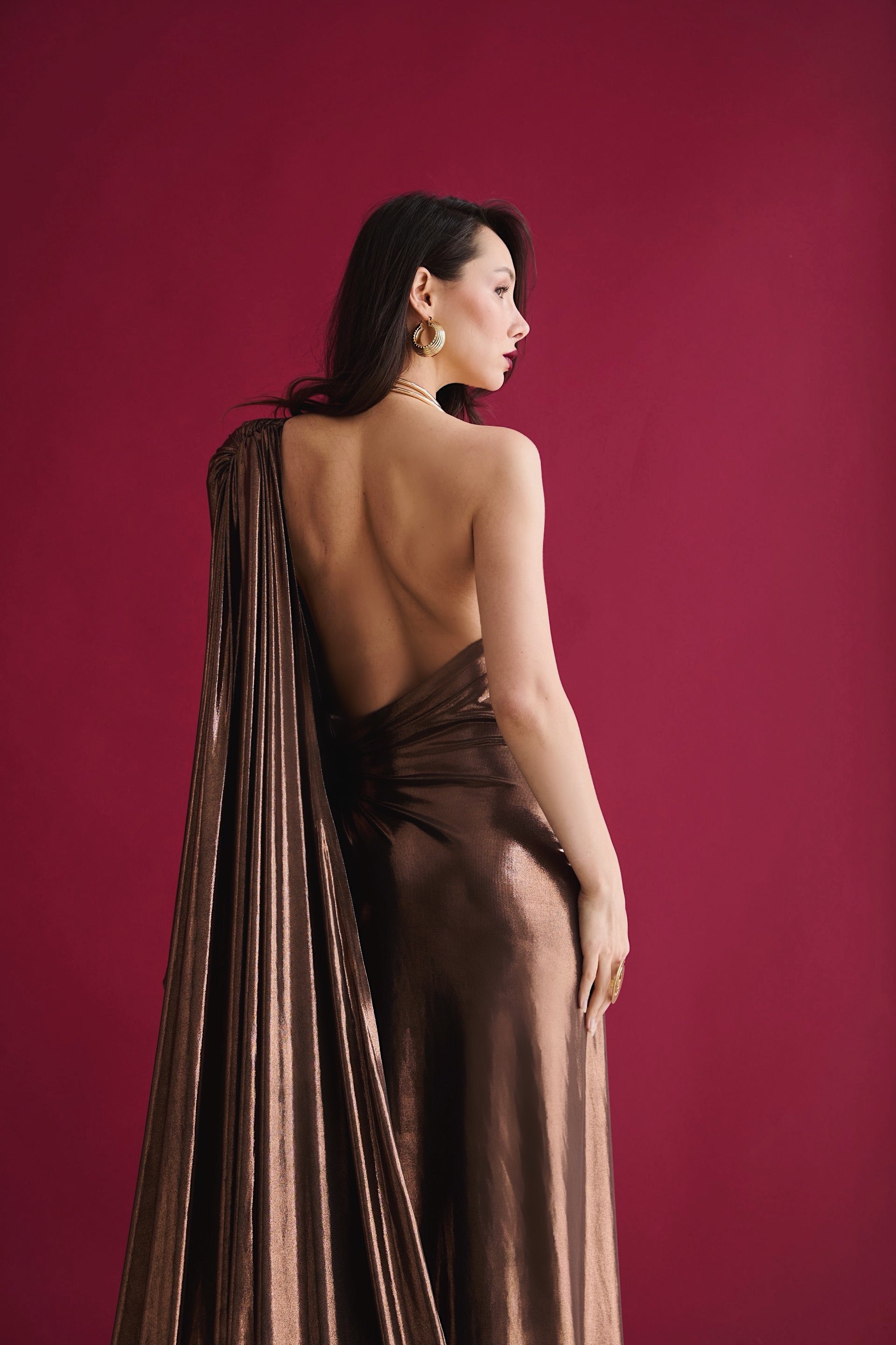 You can create a powerful, showy and stage-effective look by combining the Thalia dress with high heels and bronze-toned accessories.