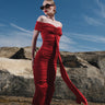 Product Features: Off-the-shoulder, long, flowing, gathered dress.