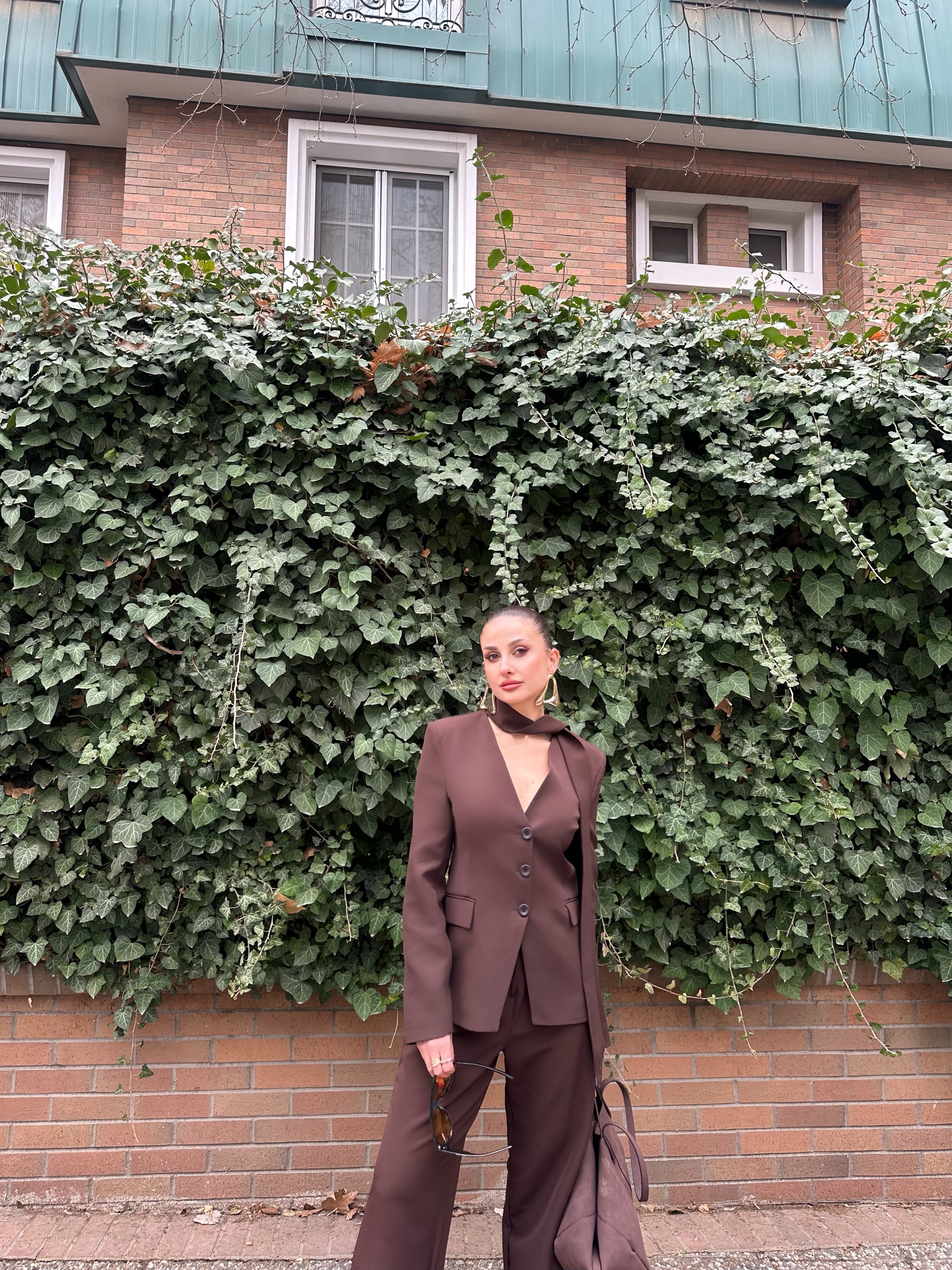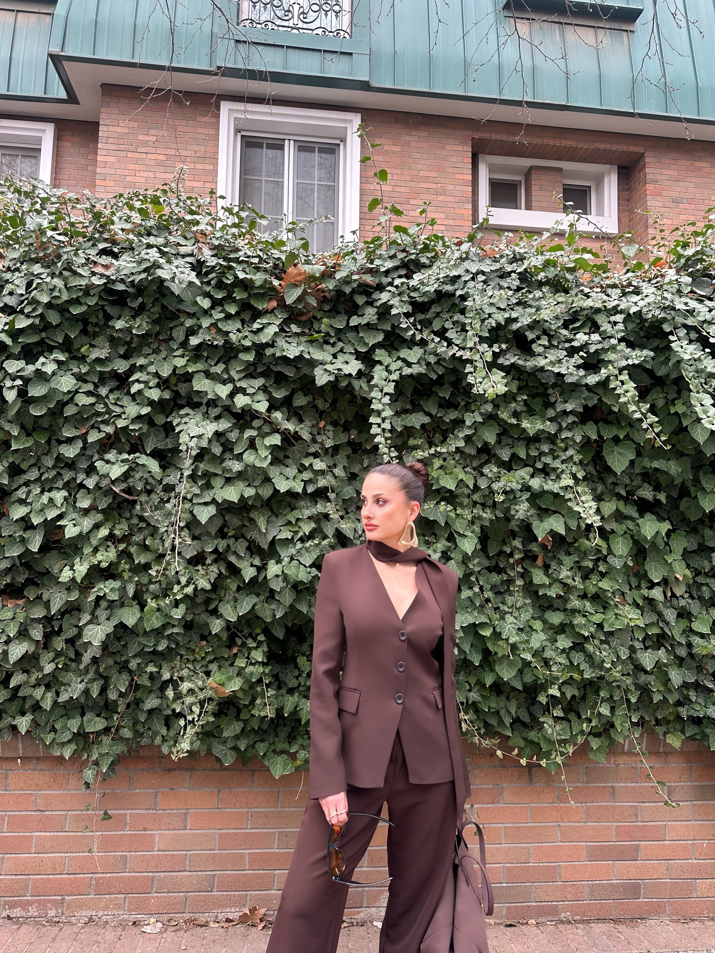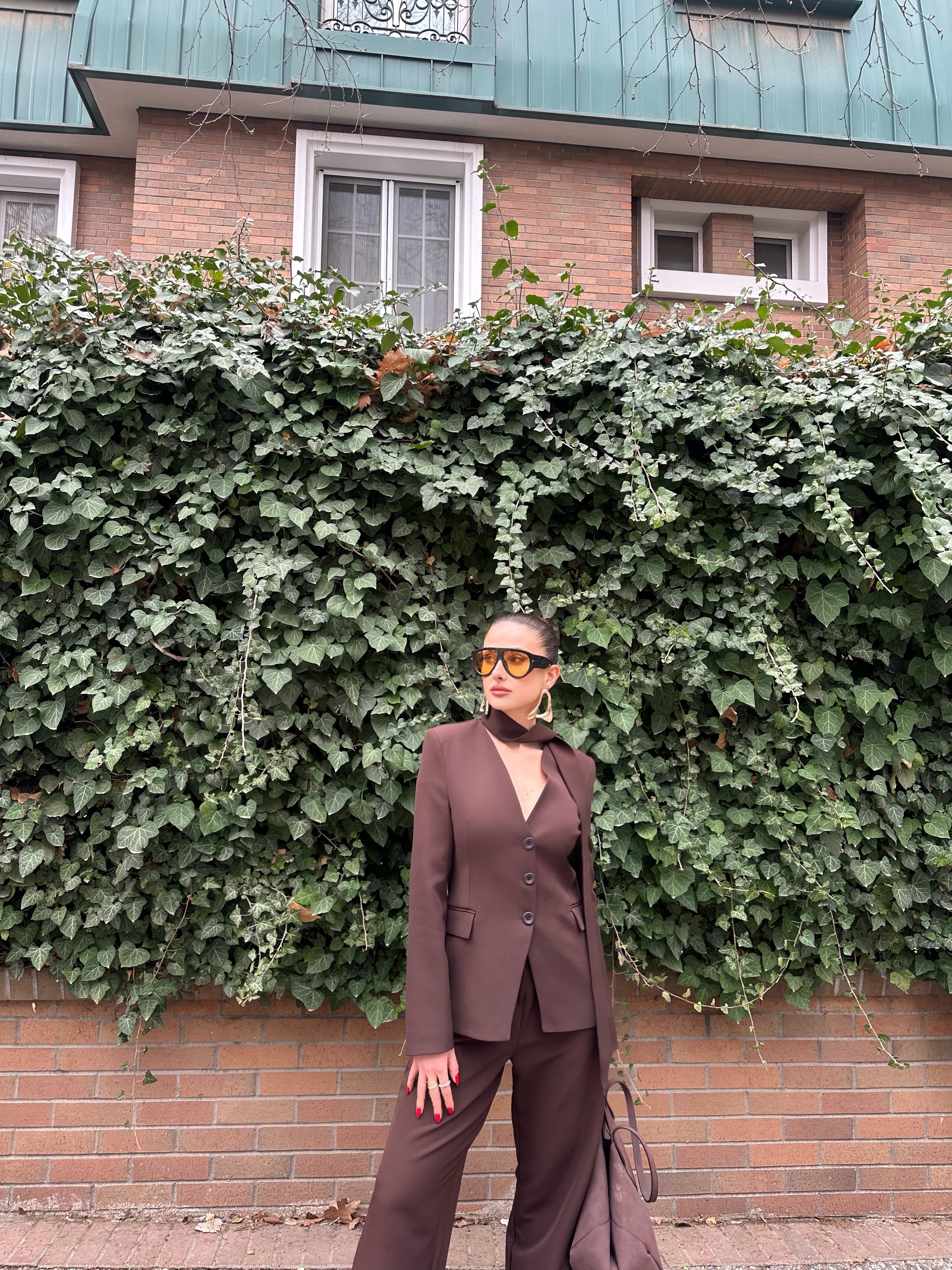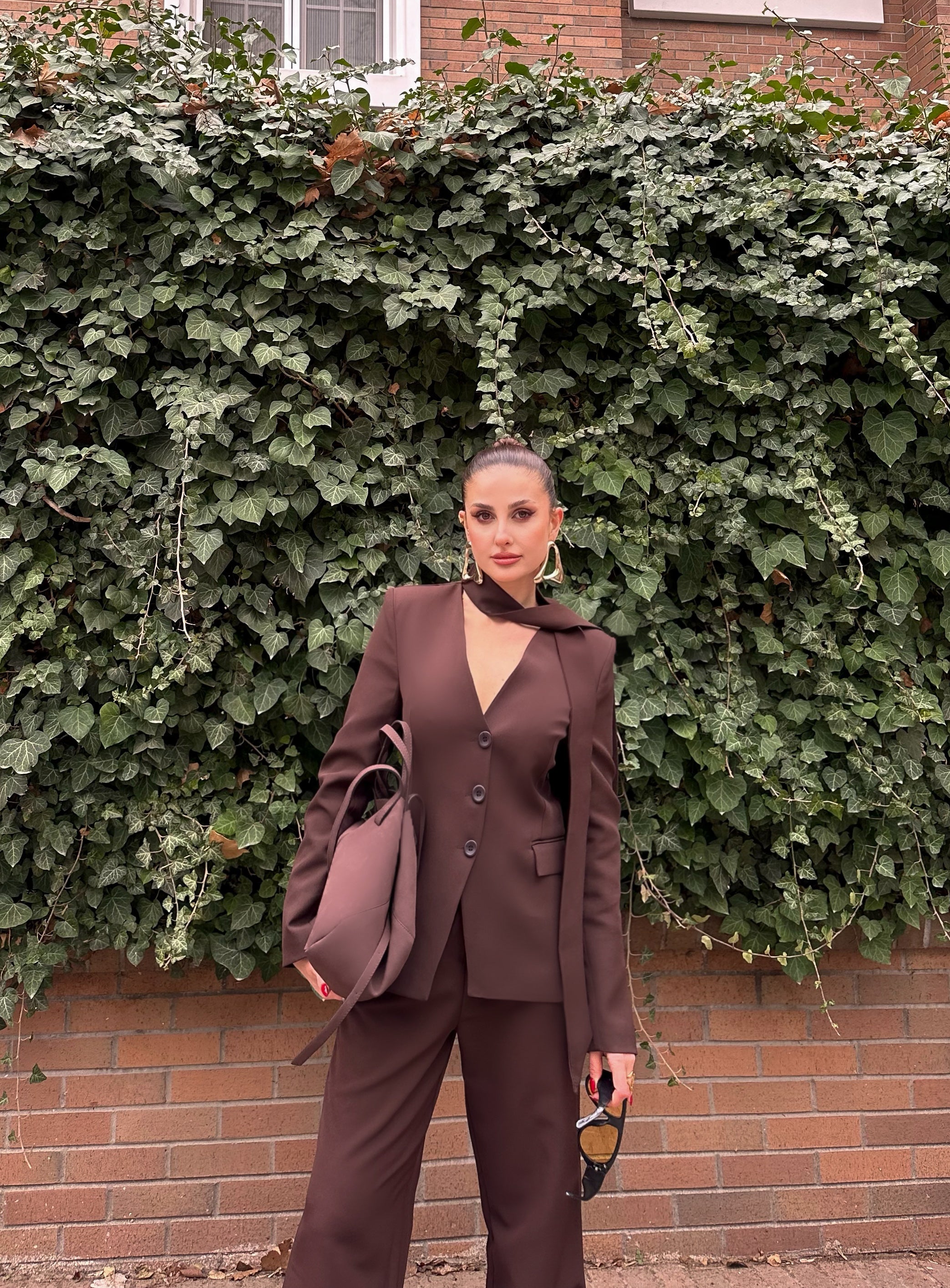 Ürün özellikleri:Blazer ceket ve yüksek bel bol paça pantolondan oluşan takımdır. V yaka, düğme kapamalı ve uzun kollu ceketi astarlıdır ve yan cep detayına sahiptir.